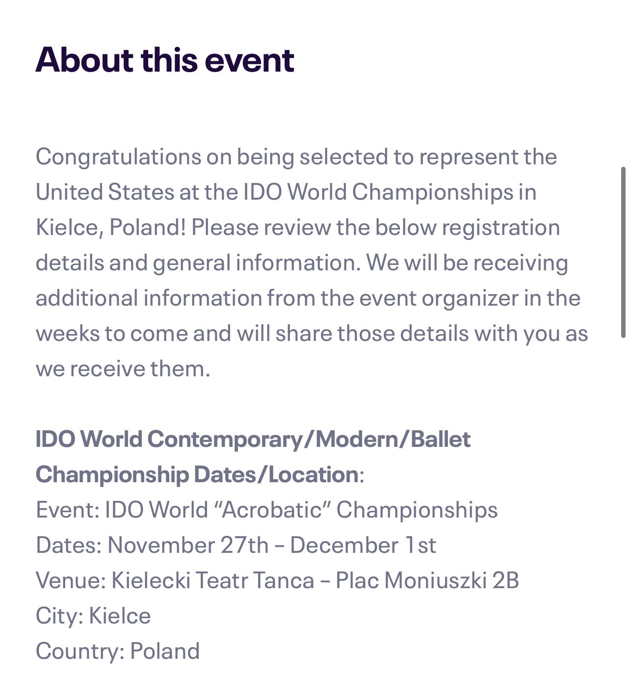 Attached is the official Team IDO letter with instructions on how to donate or sponsor Abby's journey. We hope you share in our excitement for her upcoming performance at the IDO World Championships! πΊπΈπ₯°