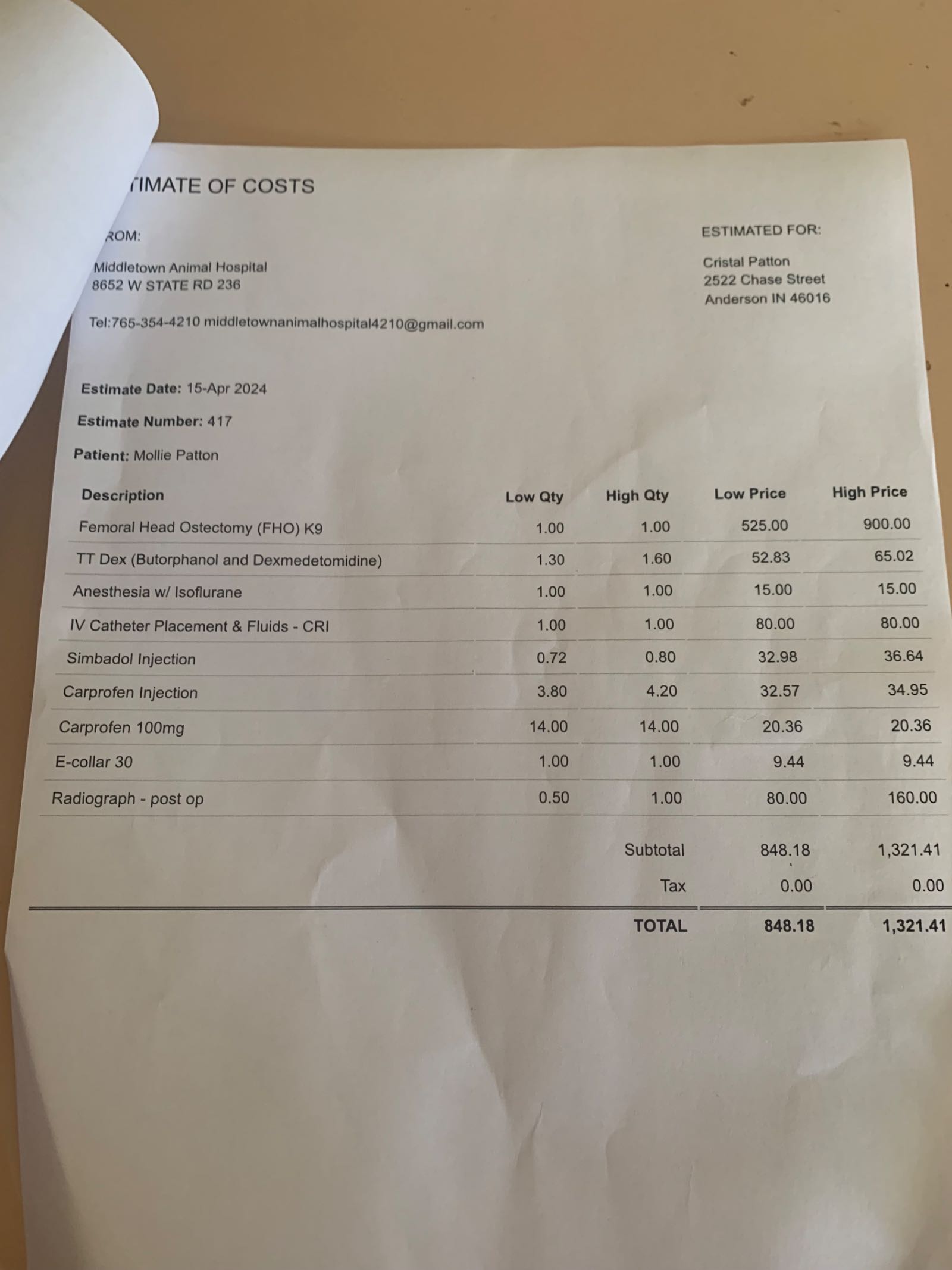 The Vets Office will send me a written estimate on Monday 4-15-24 and I will update then