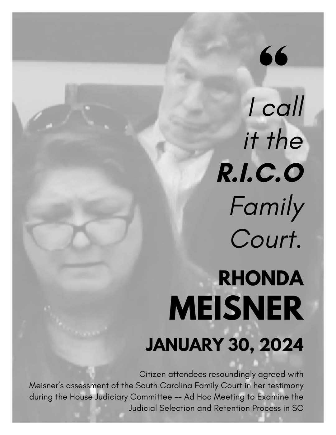 My children were illegally taken from me through a series of false accusations of physical and mental child abuse and alcohol abuse. I was required to have a paid supervisor to see my children despite being found subsequently innocent of the physical child abuse allegations. Then they said I was emotionally abusing the children. Again, I was found innocent through a directed verdict. When I proved to the internal appeals committee that the "expert witness...another lawyer, lied, I was granted a directed verdict (judgement on the pleadings). With the power of the pen, South Carolina judges make up facts, make up lies, allow attorneys to lie to their face, then call the lawyers "accomplished." Their hijinks must end. I remember when I was a little girl, my grandfather, a business man used to say "I gotta call my Liar." He is fact was saying Lawyer in such a way as to make the heard word Liar. I always thought it was funny, albeit a bit disrespectful. I have changed that opinion, the phrase was stated with "all due respect." Now, I have met some ethical hard working lawyers, but in family court, the willingness to lie is a required lapse in ethics to be successful. Nevertheless, I find myself without the ability to pay for the final transcripts and would very much appreciate a loan, donation, cheerful word or any other sort of encouragement. I along with other women have gone to jail because of the Richland County Court lapses and out right corruption. Some people think the same way and in the primary, a majority of voters said court reform should occur. I think we should give the judges a public spanking with a wooden paddle when we find them violating the law, lying, cheating etc. and then take away their judgeship. Can they just be ethical and do their job without pandering to their legal colleagues? not sure of this answer, but I do know I need to try my best. Could you please send this to 10 of your friends many small donations will end in a good result. If i can identify you, when this is over, I'll pay you back! or allow you to pay your donation forward to another mother caught in the Richland County Family Court drama! Thank you for reading, and please pray that my children heal from this horror. May God Bless you and Keep You! and make the road rise to meet you. With appreciation Rhonda Meisner.