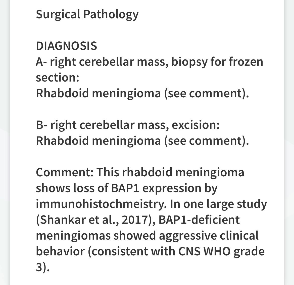 *pathology report from Dartmouth Hitchcock Medical Center in New Hampshire, where I had surgery (3/13/24). This diagnosis is not cancer, nor is it benign, and is classified as cancer-like/and requires the same approaches to treatment. BAP1 is a genetic mutation in the DNA that means that the tumor suppressor genes are off instead of on.