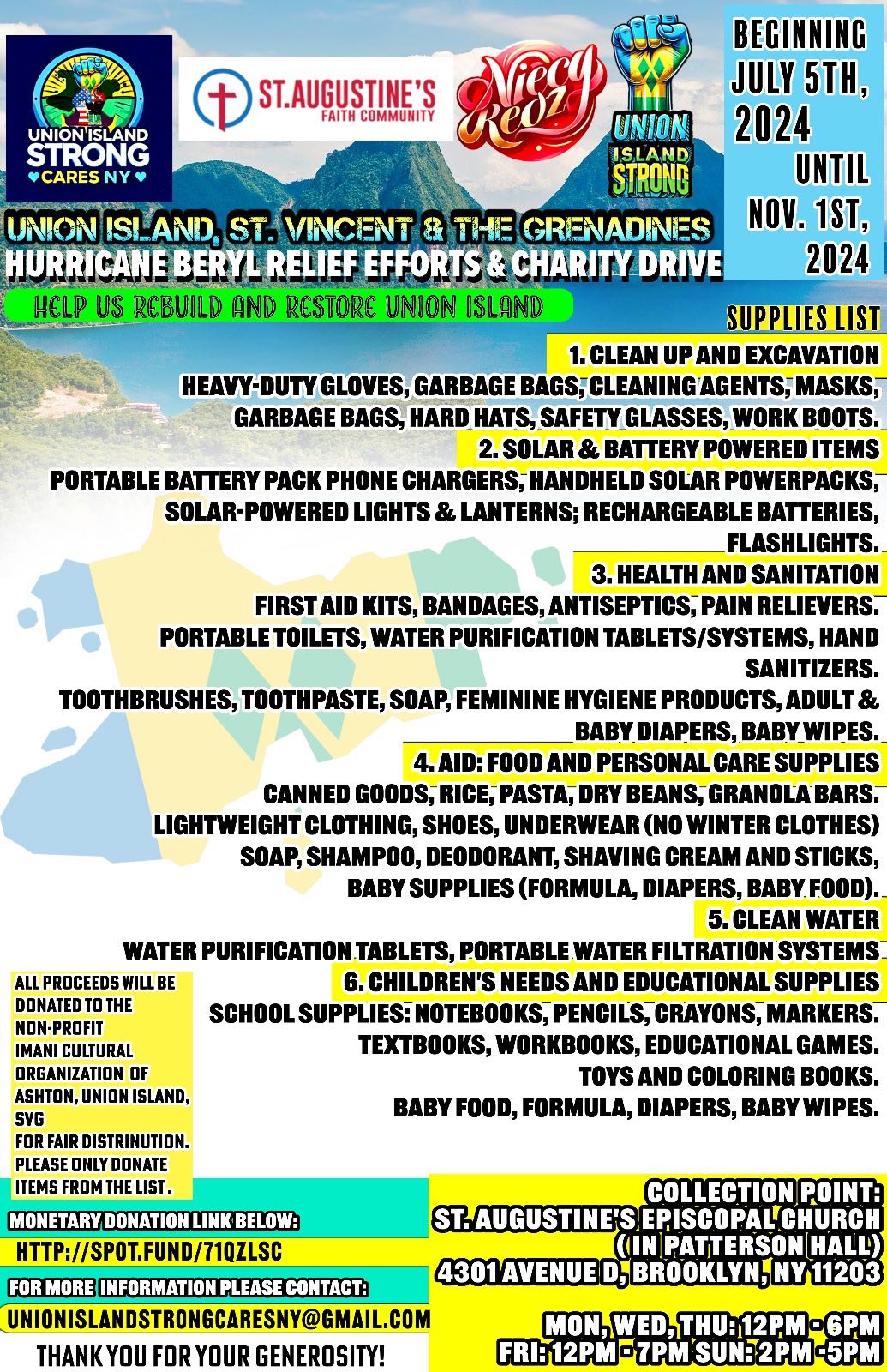 My daughter and I have launched a comprehensive relief effort and charity drive, Union Island Strong Cares NY, and have partnered with St. Augustine’s Episcopal Church. We focus on critical areas such as clean-up, health and sanitation, food and personal care supplies, clean water, and children’s needs. Your donations are crucial in helping us address these needs and bring relief to the affected communities.