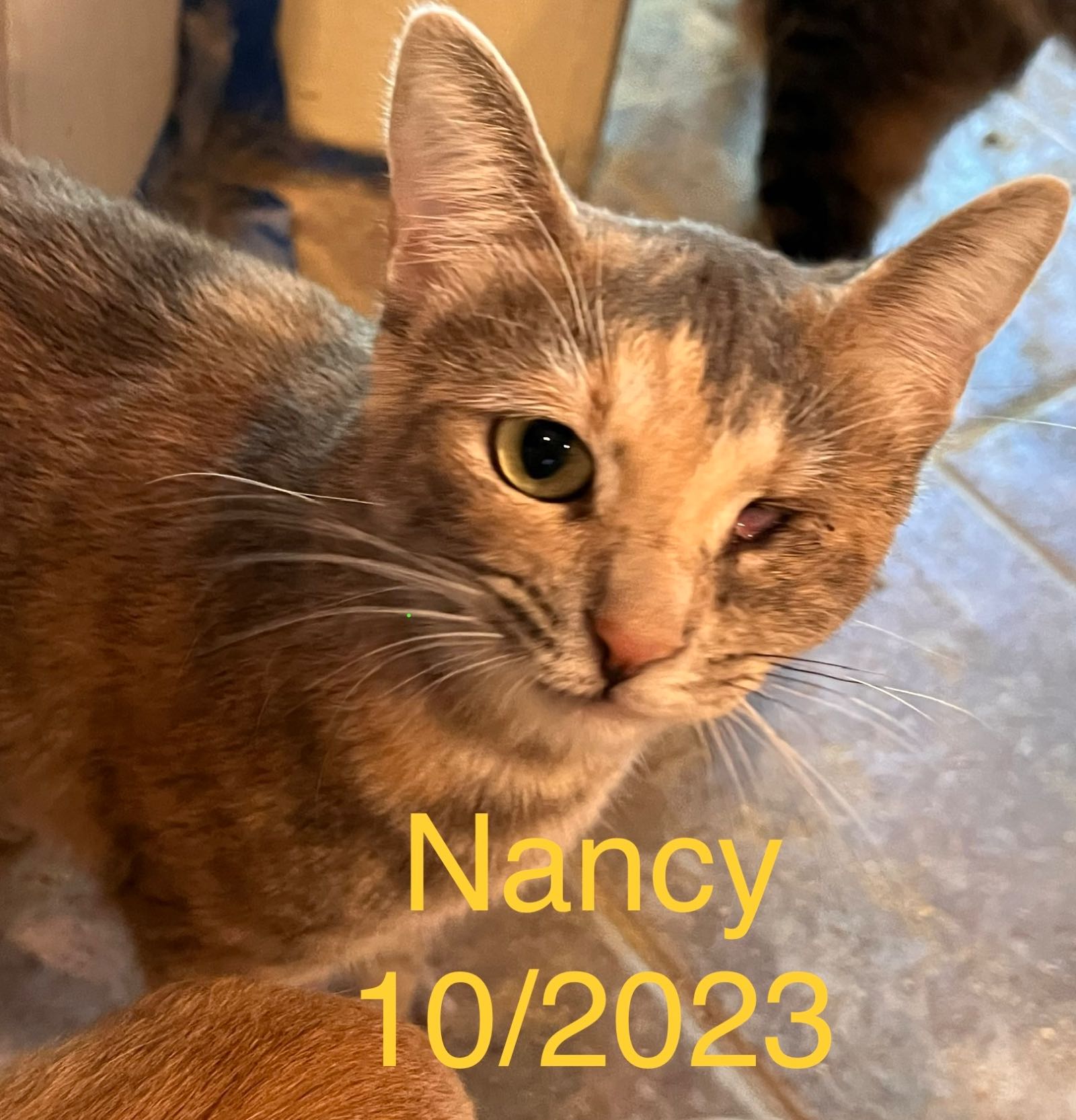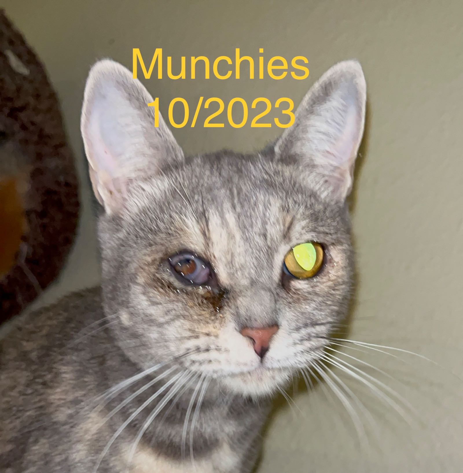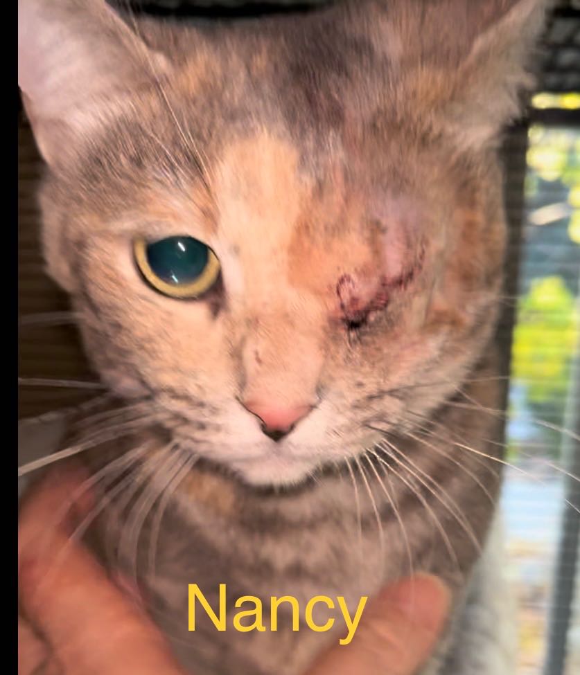 Four kitties, in group rescue, need more than the usual vaccinations, spays, and neuters. At just over a year old, Munchies, Nancy, and Bernard each need one eye enucleated (removed), and Ambrosia ended up not needing a second surgery and found a home.