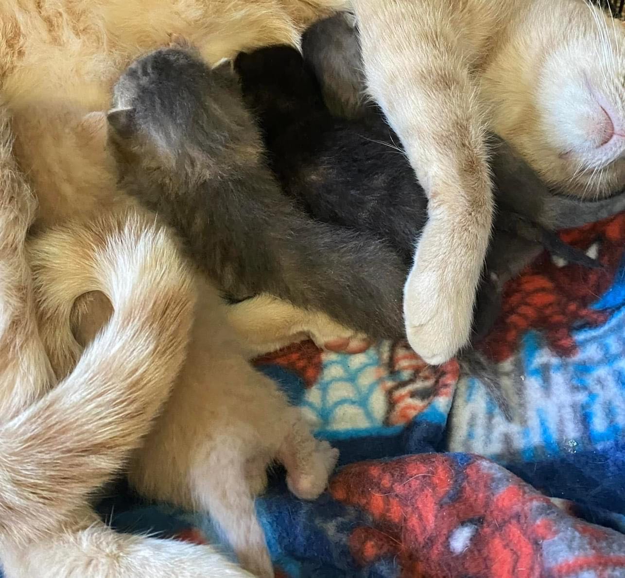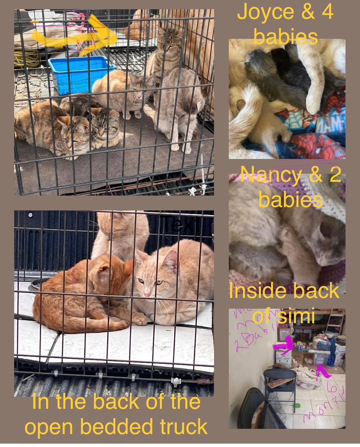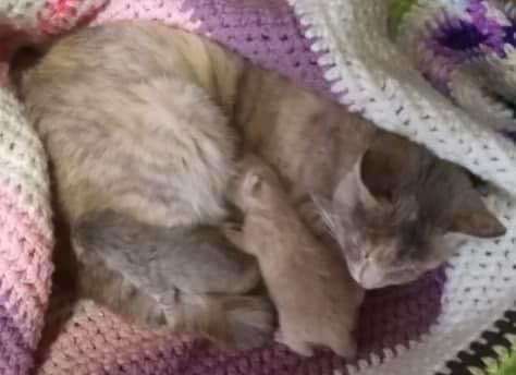 A quick decision is made. At that moment I can only take the mother cat (later named, Joyce) with her four newborns, and exchange numbers with Jean. A few days later a call from Jean led to picking up two newborn kittens and their young mother with a bad eye (later named Nancy) that I'd seen in the back of the truck.