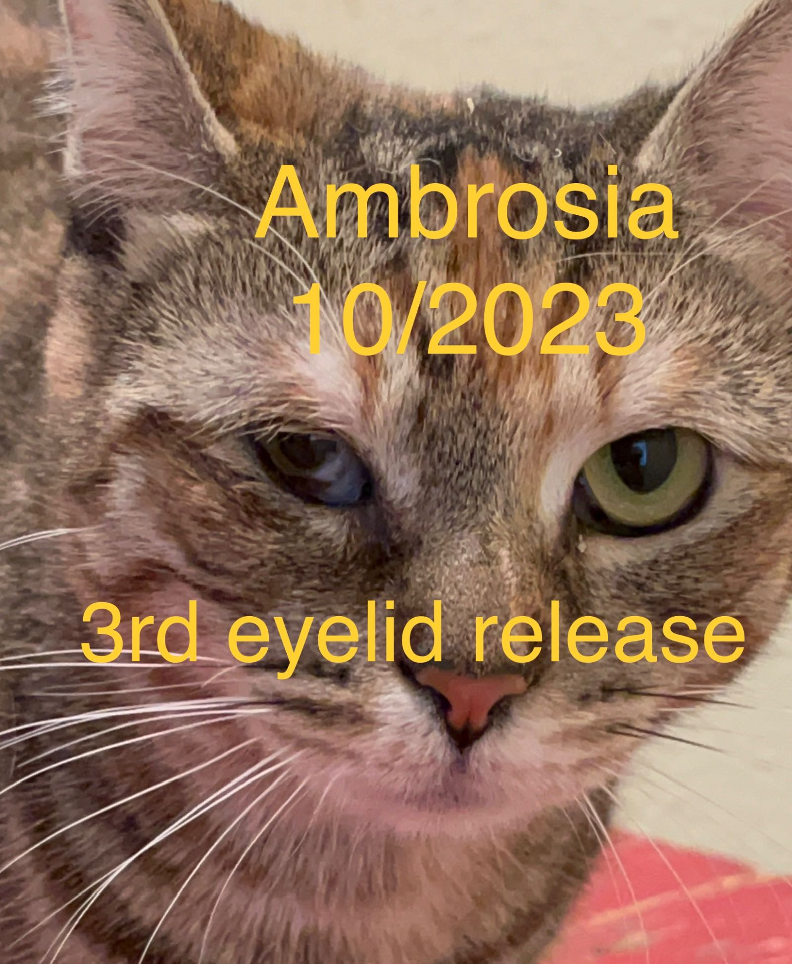 Ambrosia had double luck! Her eye was more closely examined prior to surgery and it was determined it was best not to do a second third eye release as it would only create more scar tissue and the third eye lid would only reattach. And a staff member gave Ambrosia a home!
