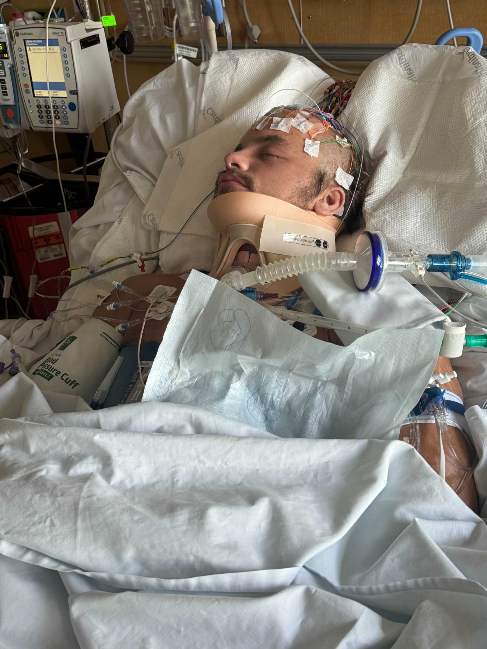 For the past two weeks, his family has been at his bedside 24/7, not knowing if he was going to pull through. The biggest hurdle has been managing his ICPs (intracranial pressure), which, until this past Friday, were dangerously high, ranging from 22 to 41.