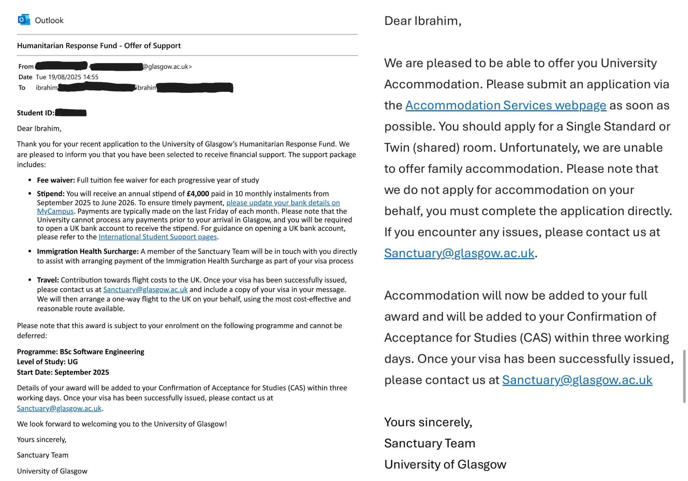 A few months ago, I applied to the University of Glasgow for the Dima Alhaj Scholarship for Palestinians. I was awarded a study place, but sadly I did not win the scholarship. The results were announced at the end of July, and I was rejected. It is deeply unfair that the university has given over 40 scholarships to Ukrainian students, yet only one seat to students from Palestine. Your donation through this campaign will allow me to pay my tuition fees to the University of Glasgow and be safely evacuated there.