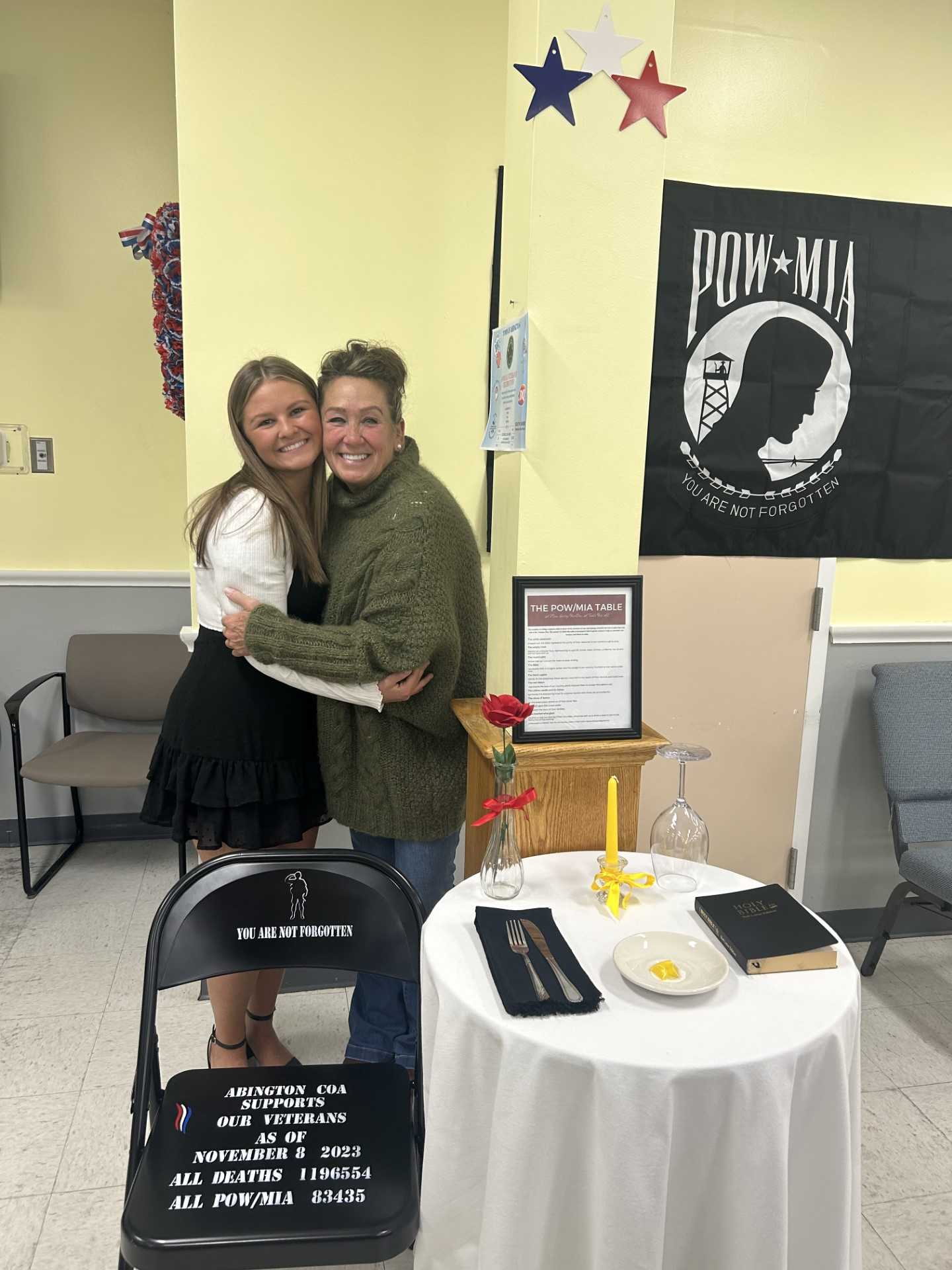 I partnered with Veteran Bob Rice, who crafts POW/MIA chairs and distributes them on a national level to all 50 states. Mr. Rice only charges for the cost of the chair and the stencil only, as we both donate our time and labor. I have also received advice and guidance from Abington's Veteran Agent Adam Gunn, who has been an incredible mentor.