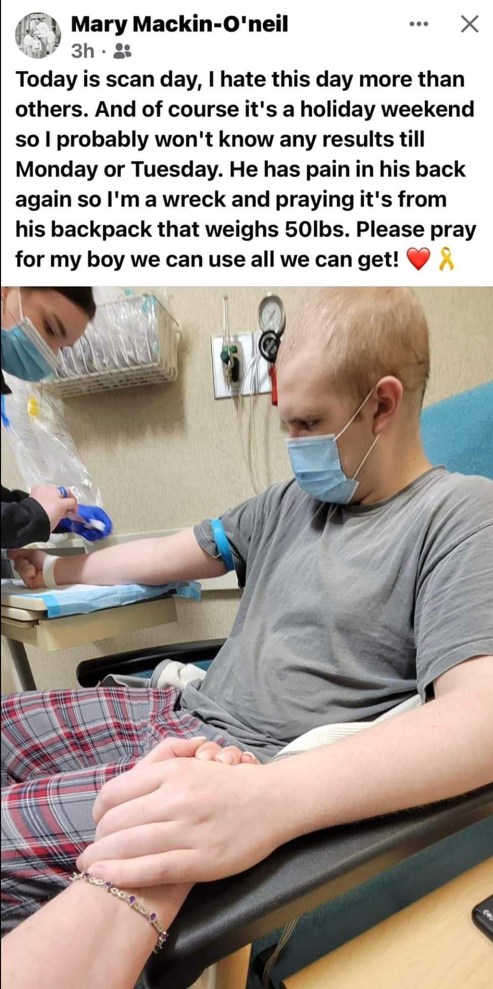 In May of 2020 my nephew, Aidan O'neil suffered for many weeks with pain in his back and legs. His doctor insisted it was growing pains. After no relief, and symptoms worsening to the point of Aidan barely being able to walk his parents took him to the hospital. After having an MRI the doctors discovered a tumor on his spinal cord. They immediately rushed him into surgery to try to remove the tumor. His parents feared the worst. In June of 2020 he was diagnosed with Ewing Sarcoma "a rare and aggressive form of cancer that affects only 200 children in the United States each year".