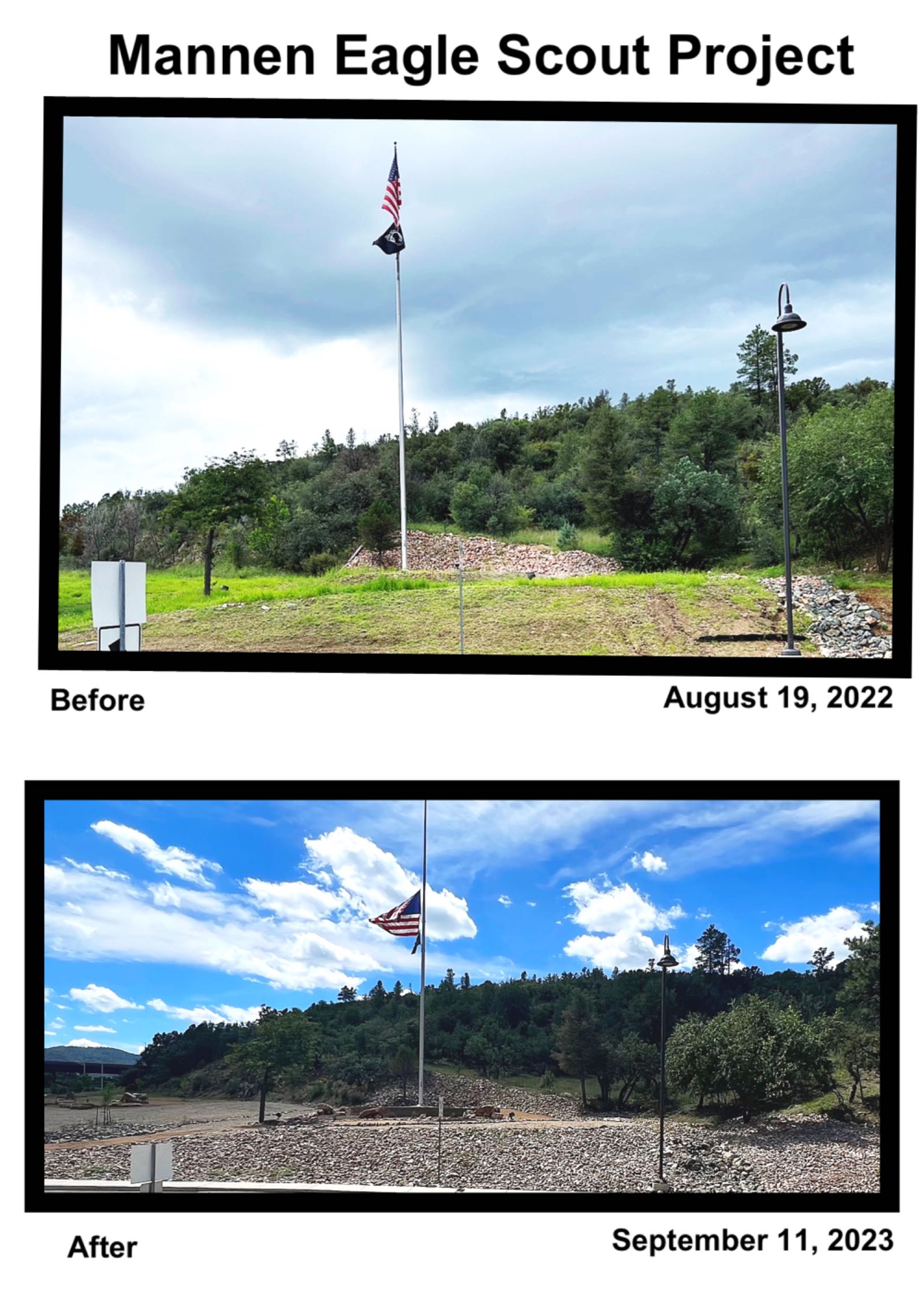 Josh and Jordan Mannen have achieved their Eagle Rank from the Boy Scouts of America. Thanks to the amazing support from the community they enhanced the entrance of the Prescott Veterans Hospital facility. The projects consisted of two terraces and a flag pole on the left side of the entrance to the VA. Josh’s Eagle Project is the lower terrace which included installing riprap on the exposed hillside and installing a xeriscape garden with cactus and decorative boulders below the top terrace. Jordan’s Eagle Project is the top terrace which included installing a Versa-Loc retaining wall to stabilize the exposed flag pole mound, installing pavers around the flagpole and creating a DG walkway from the sidewalk to the flagpole.