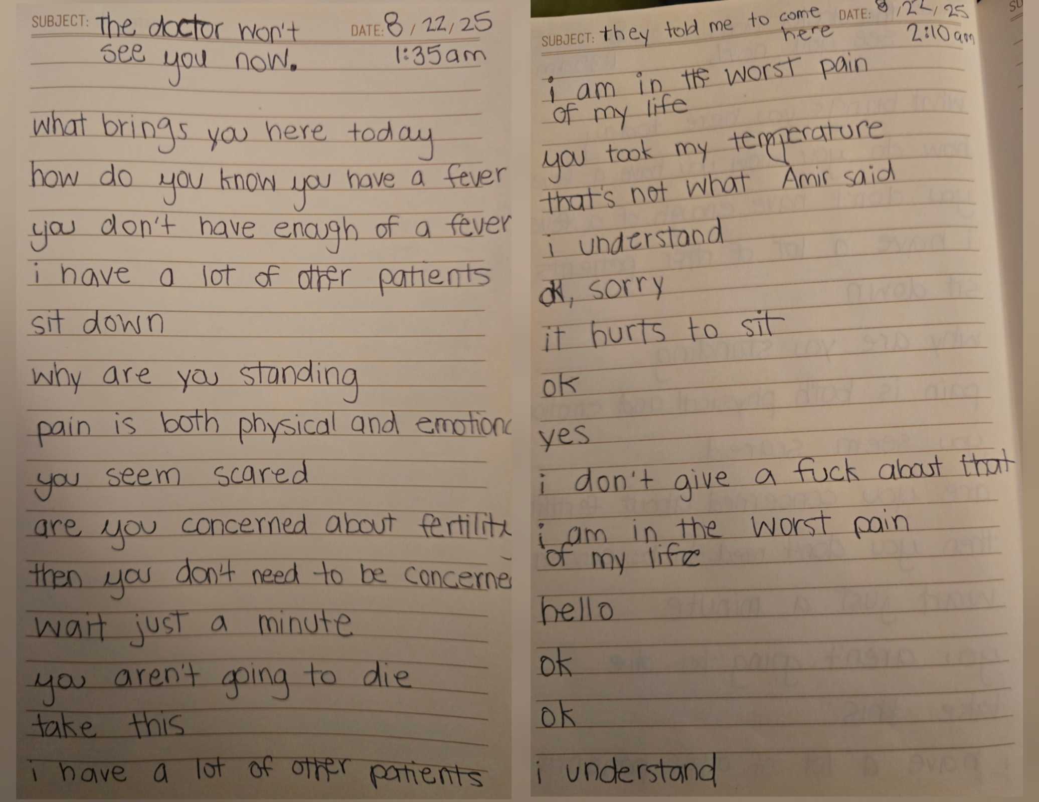 Below are two non-fiction poems or abridged transcripts documenting the conversation I had with the ER doctor who refused to admit me on 8/21. I hope, if nothing else, that you can sense my pain and fear and know that this emergency itself was unjust.