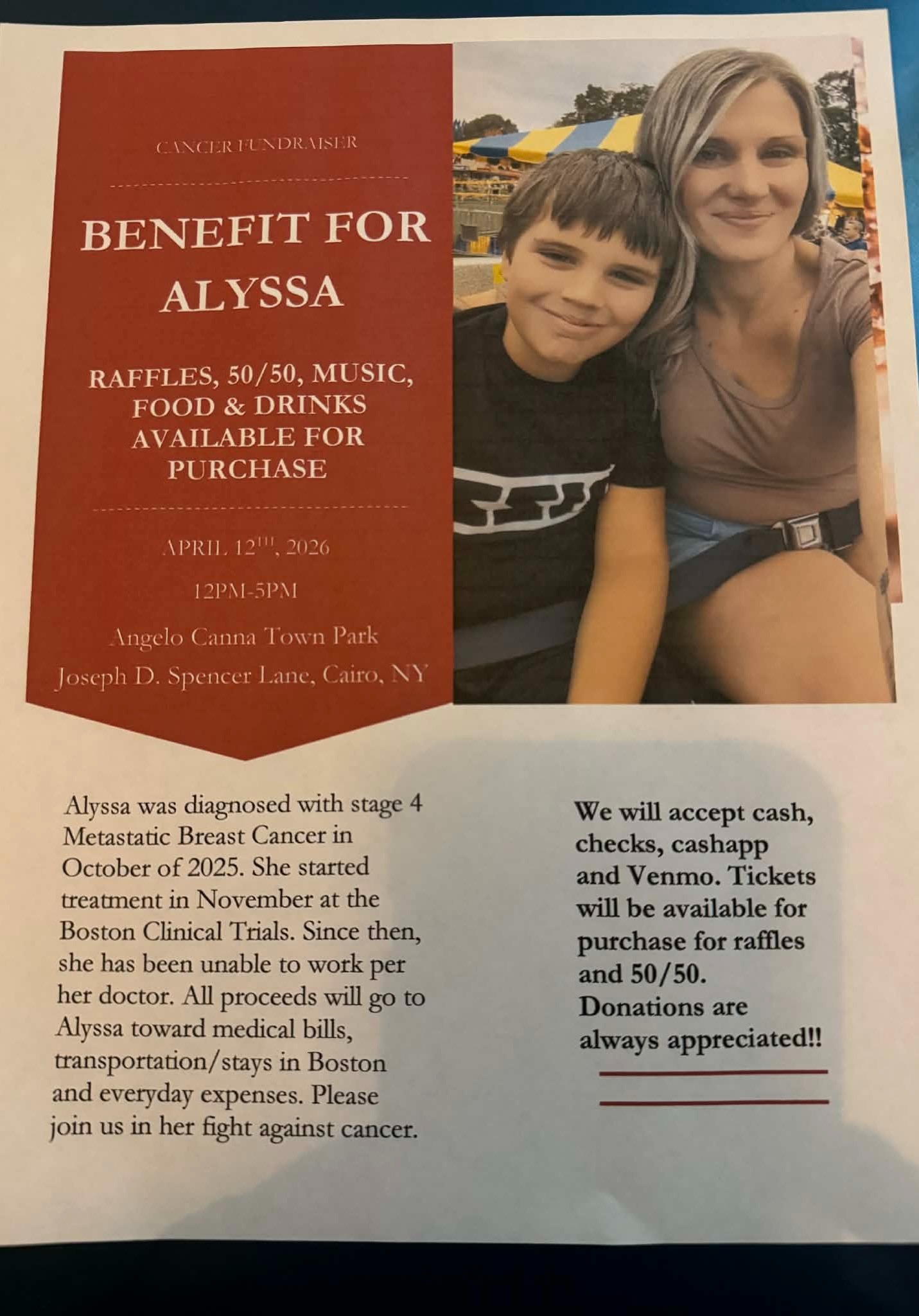 As a mother your worst nightmare is having a sick child. I can't even explain the emotions that our family are going though. Every single one of them. My 33 year old daughter Alyssa has stage 4 cancer. What started as a bunch of doctors misdiagnosing a spot on her breast over the last year or so, has now become an aggressive cancer since March, the cancer will take her one breast, we already know that, but the cancer has spread into the spine, and two ribs. Alyssa is a strong, caring, wonderful, beautiful young mother of a 10 year old son. We are not in anyway giving up, we are waiting on word to head to Boston for a clinical trial that has shown to do very well so far. Her oncologist has high hopes for her to do well. I feel so helpless, as her mother I should be able to fix this, but I can't, I can only be by her side through this and offer as much support as I can. Alyssa will be out of work for an undetermined amount or time. Her wonderful co-workers at Ferguson gave her a good head start on covering her bills for couple of months but this is now looking like a longer fight then we expected. If you can't donate, can you please pray that my baby girl gets to stay here for a long long time.