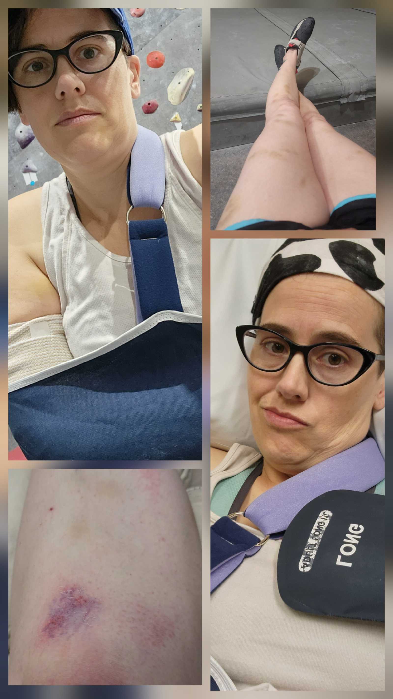 "Broken Elbow Beki" and "Bruised/Banged up Beki" are just 2 examples of how weakness and poor coordination affect my rock climbing. (scroll fast if pics of bruises bother you).