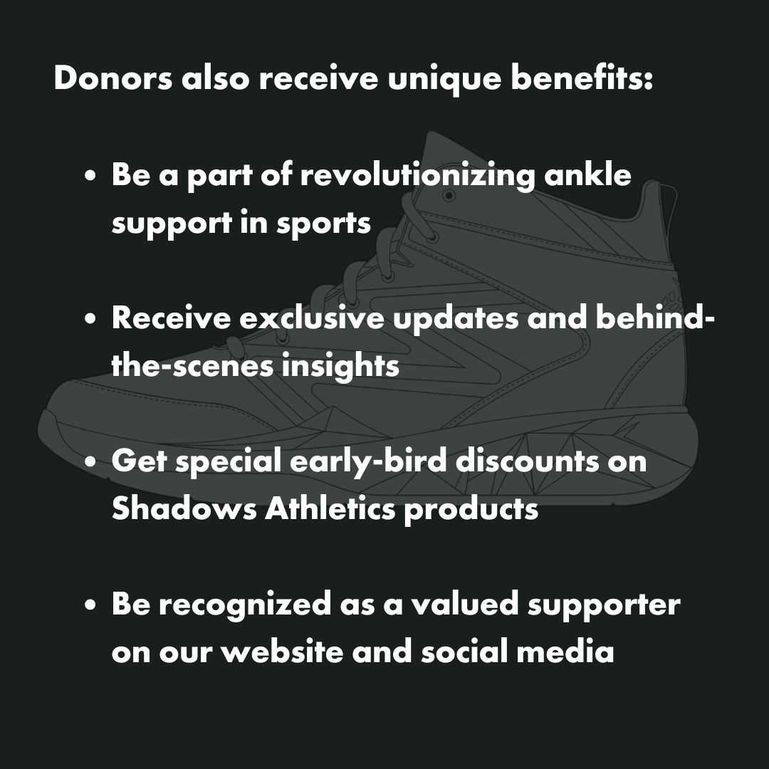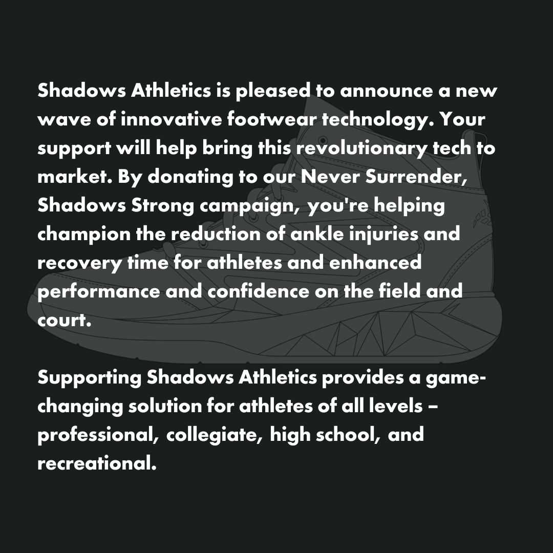 Shadows Athletics⢠was born from a dream as a 7th grader that has become a tangible footwear masterpiece that will forever change lives. Our revolutionary athletic footwear is designed to help reduce the occurrence of ankle sprains, enhance stability, and improve overall balance. This cutting-edge technology has the potential to safeguard the careers of athletes and provide valuable protection to players at all levels.