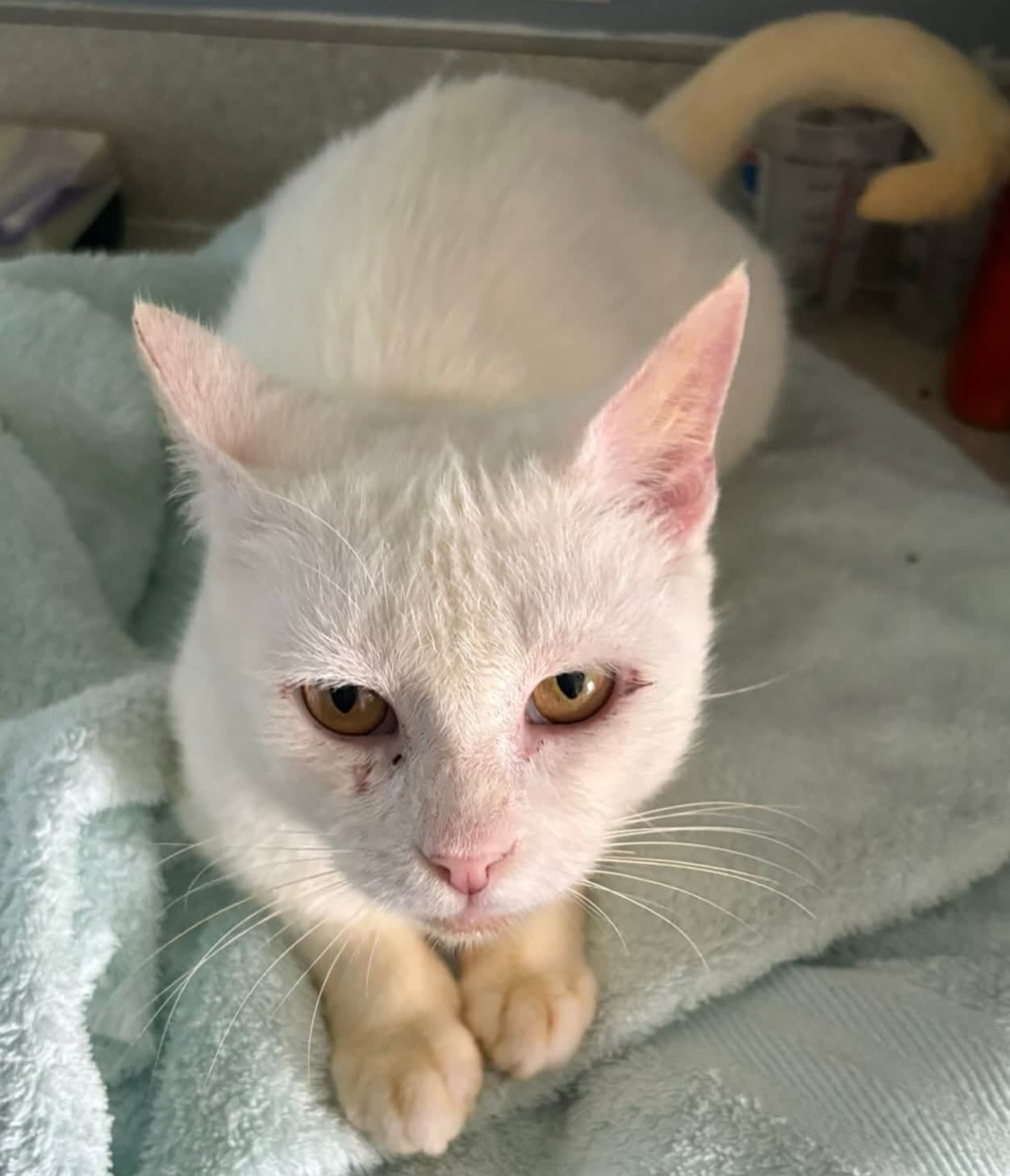 My friend refused to leave Peri to die a slow painful death, so with the distraction of tasty wet catfood, she scooped Peri into a carrier and brought her home.
