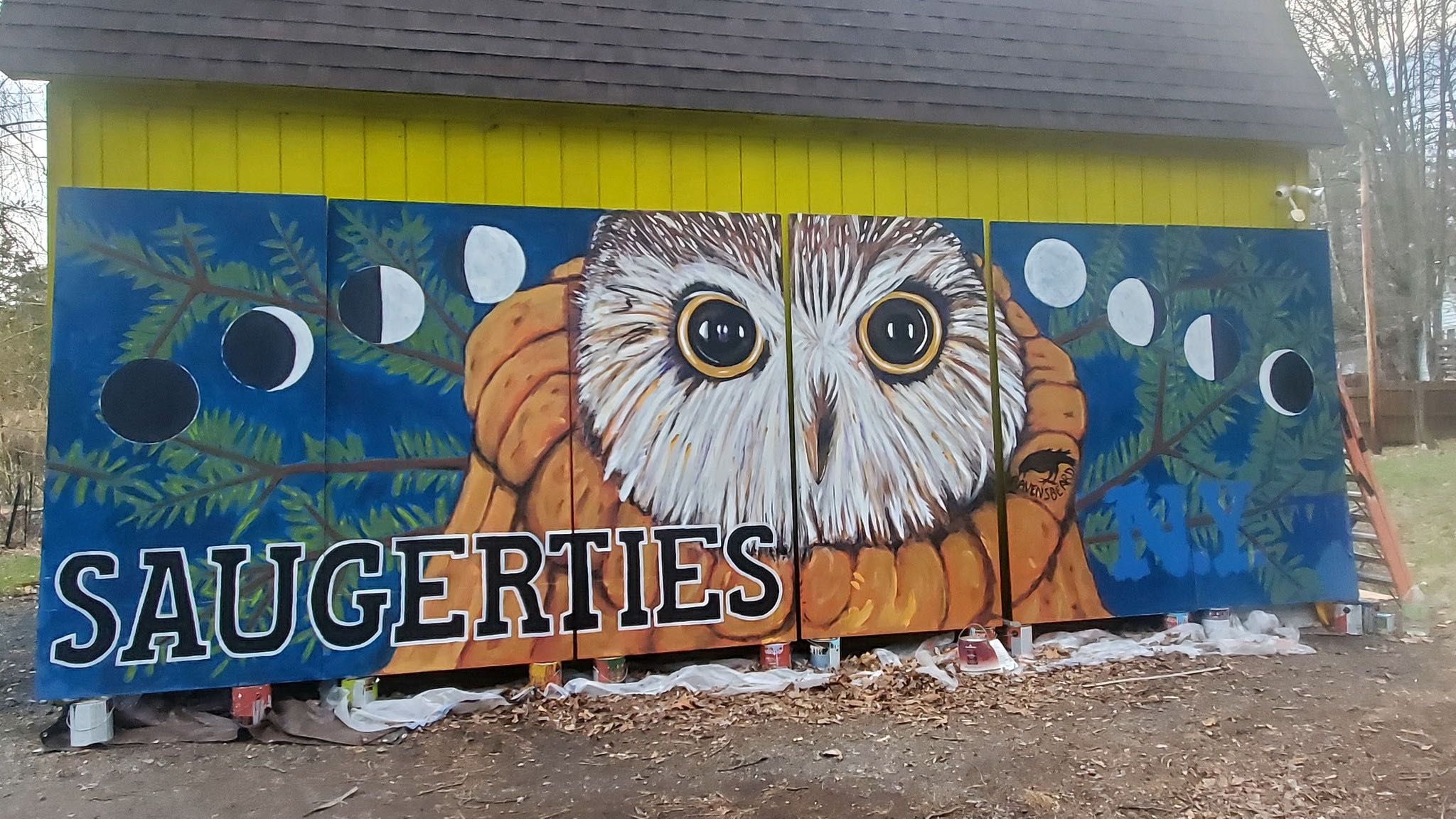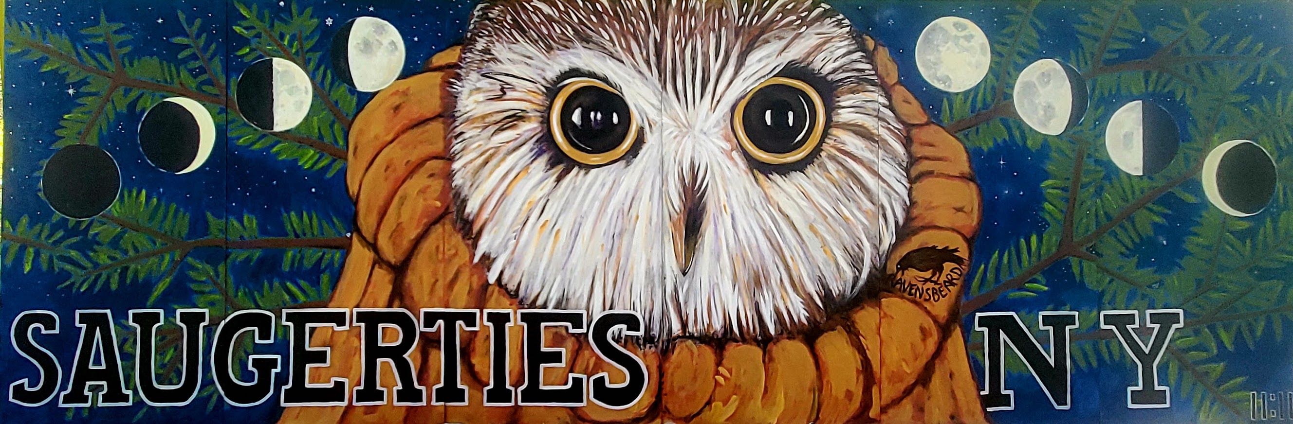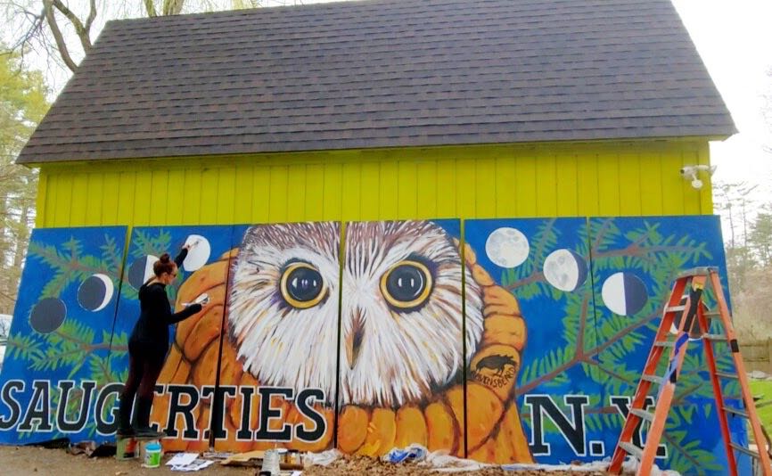 I've received permission from the building owners and the Village of Saugerties to paint a new mural in this location and the image of Rocky the owl kept popping into my mind. Rocky was the owl found in the Christmas tree last year at Rockefeller Center...the tree orginated in Oneonta and after his discovery, Rocky was returned to Saugerties for rehabilitation and release (https://ravensbeard.org/pages/rockefeller-the-owl-1)