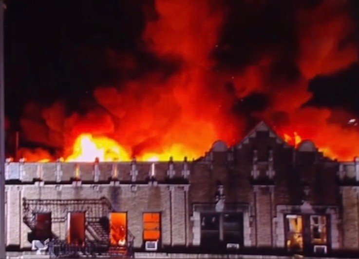 "Firefighters battled a five-alarm fire in an Upper Manhattan apartment building early Saturday morning. Officials say flames broke out around 2 a.m. at 617 West 141st Street." (Marcus Solis via abc7).