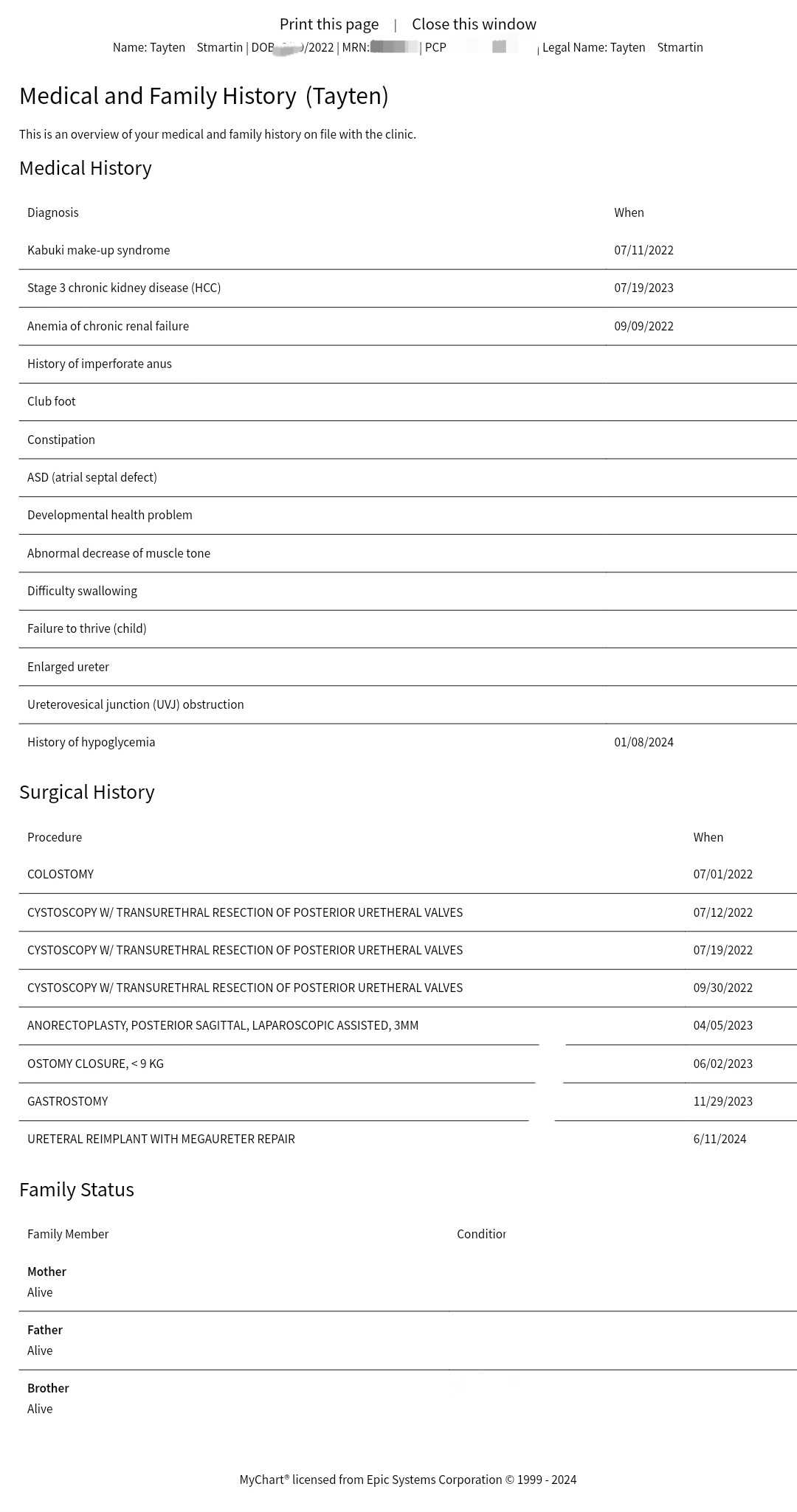 Tayten was diagnosed with a rare genetic syndrome before birth, called 'Kabuki syndrome.' Tayten was born with multiple abnormalities due to this syndrome. This syndrome has attacked some of his major vital organs, including his heart & kidneys. Tayten has had 10 operations (surgical history provided excluding his most 2 recent operations 8/2024 & 11/2024) and over a dozen hospitalizations since birth. This little warrior isn't done yet..