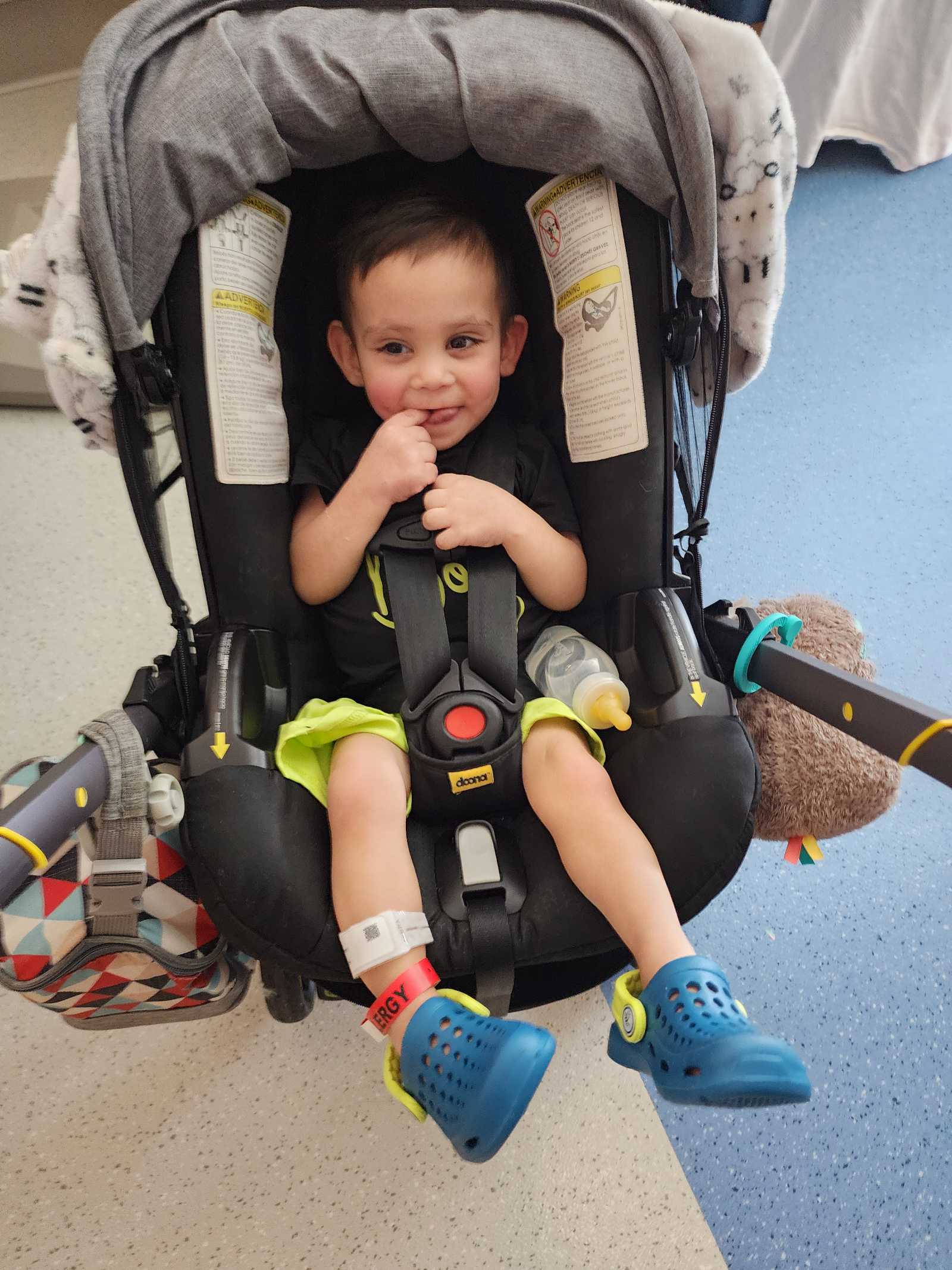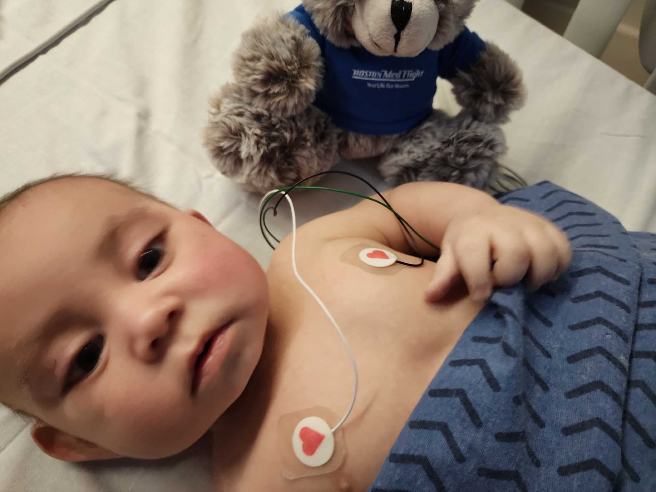 In this picture, Tayten had to unexpectedly take a Med flight from Fall River to Boston, they wouldn't allow mom to ride with him and he was scared 😔 To butter him up to become their friend, the EMTs gave Tayten a cute little teddy bear and he felt much more comfortable on this new ride 😊