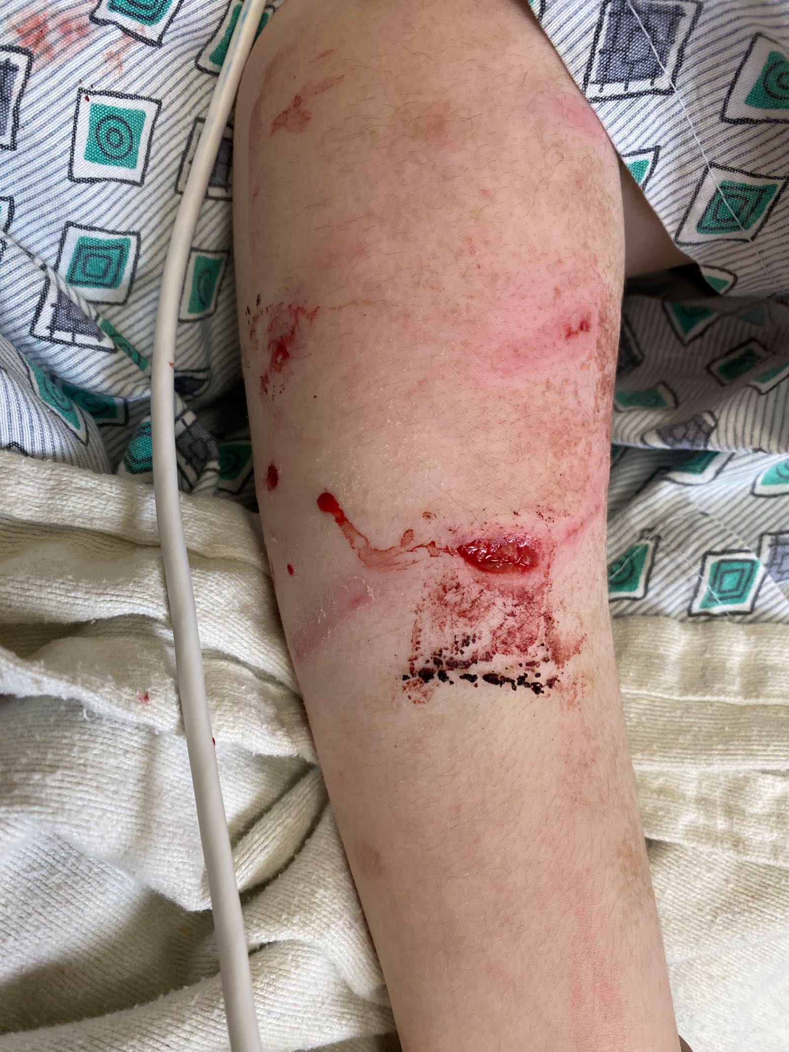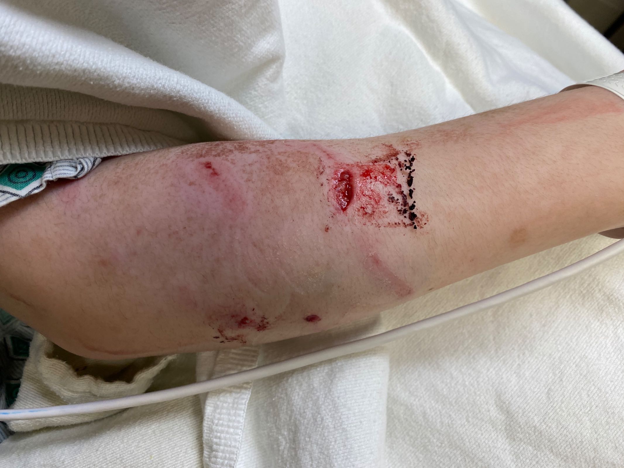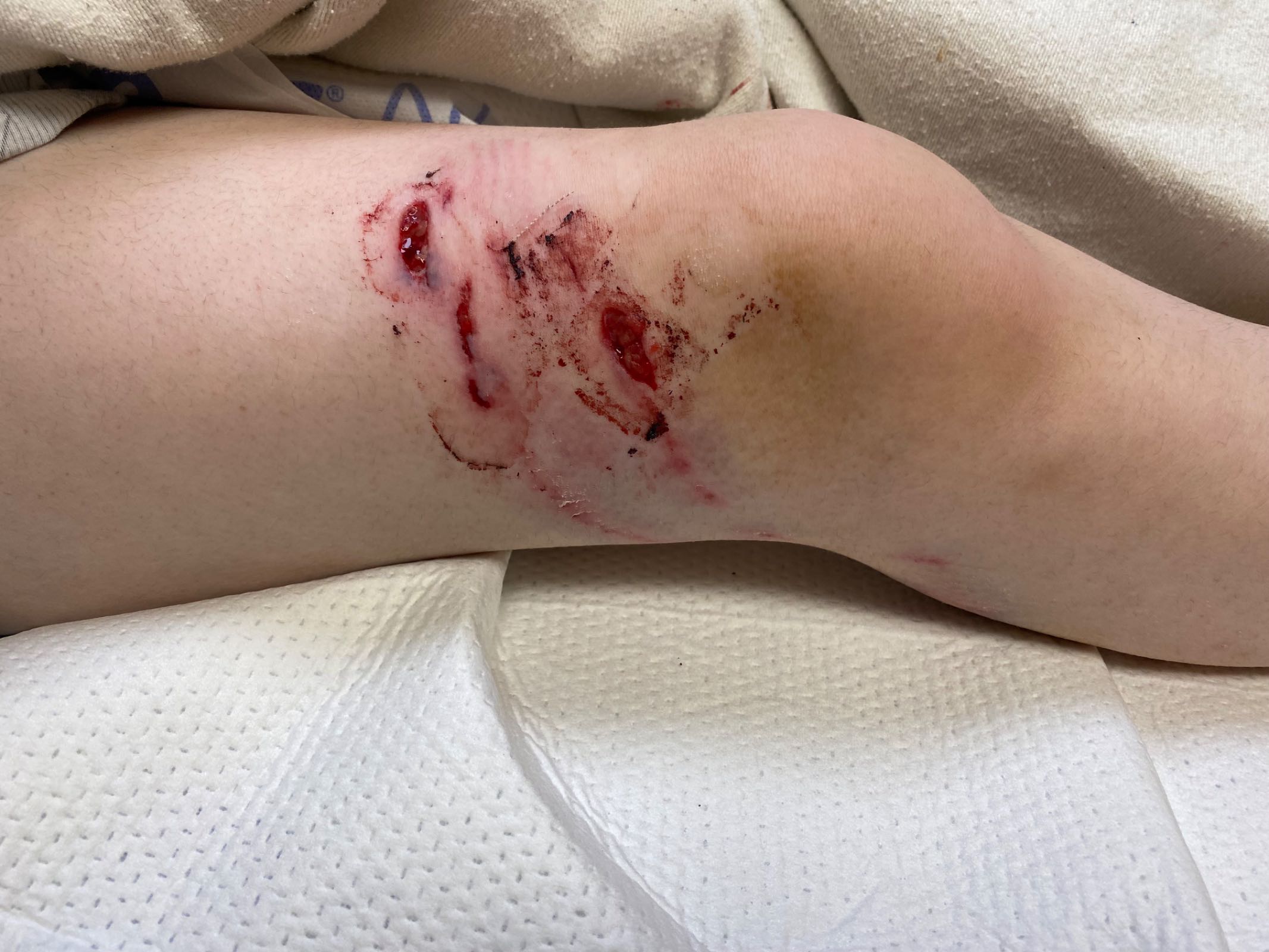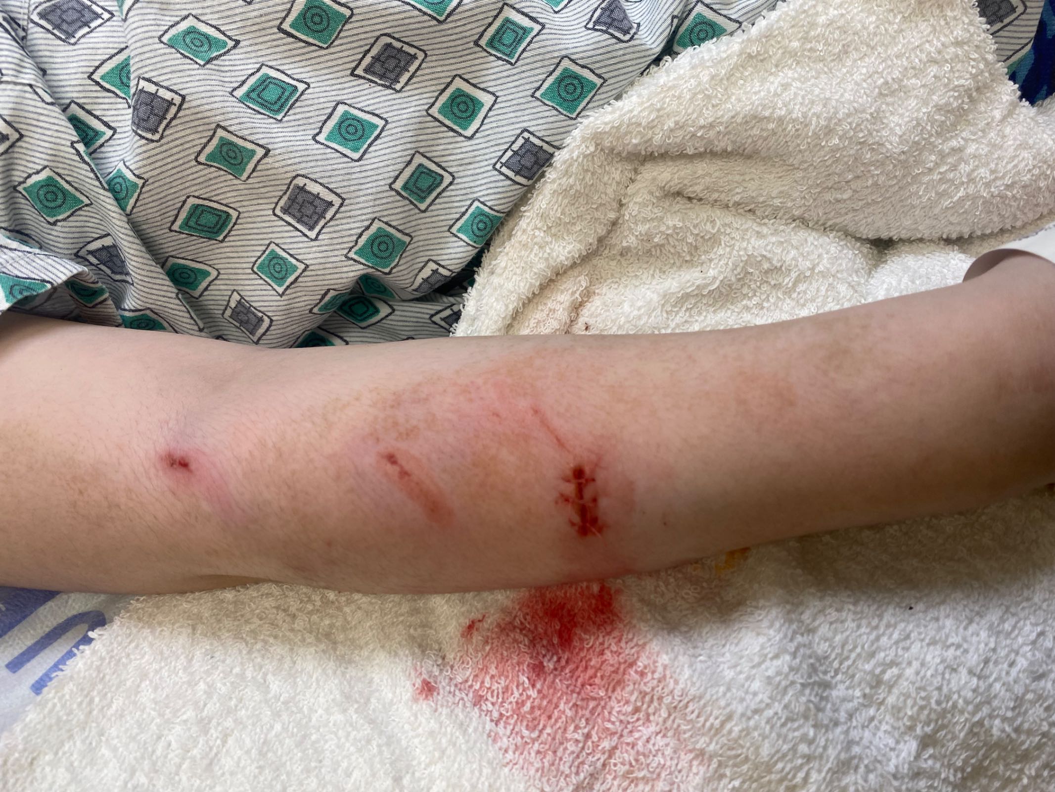 My beautiful boy had a hole in his face, and numerous wounds to his right arm and right leg. It was heartbreaking to hear his screams as the surgeons gave him injection after injection for rabies around those wounds, and then he had to endure 18 stitches to close them. The surgeon said he may indeed need cosmetic surgery to revise the scar on his face.