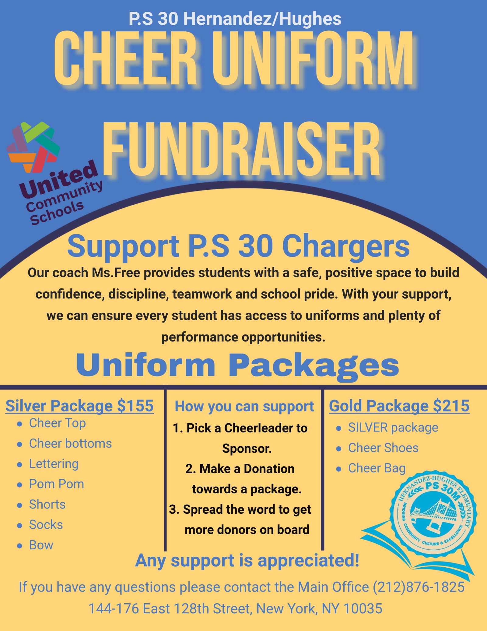 I'm raising funds to provide official Cheerleading uniforms for our hardworking cheerleaders (P.S 30 Chargers). My cheer squad represents school pride, teamwork, confidence, and positivity! Having proper uniforms allows them to perform with pride and feel like a true team.