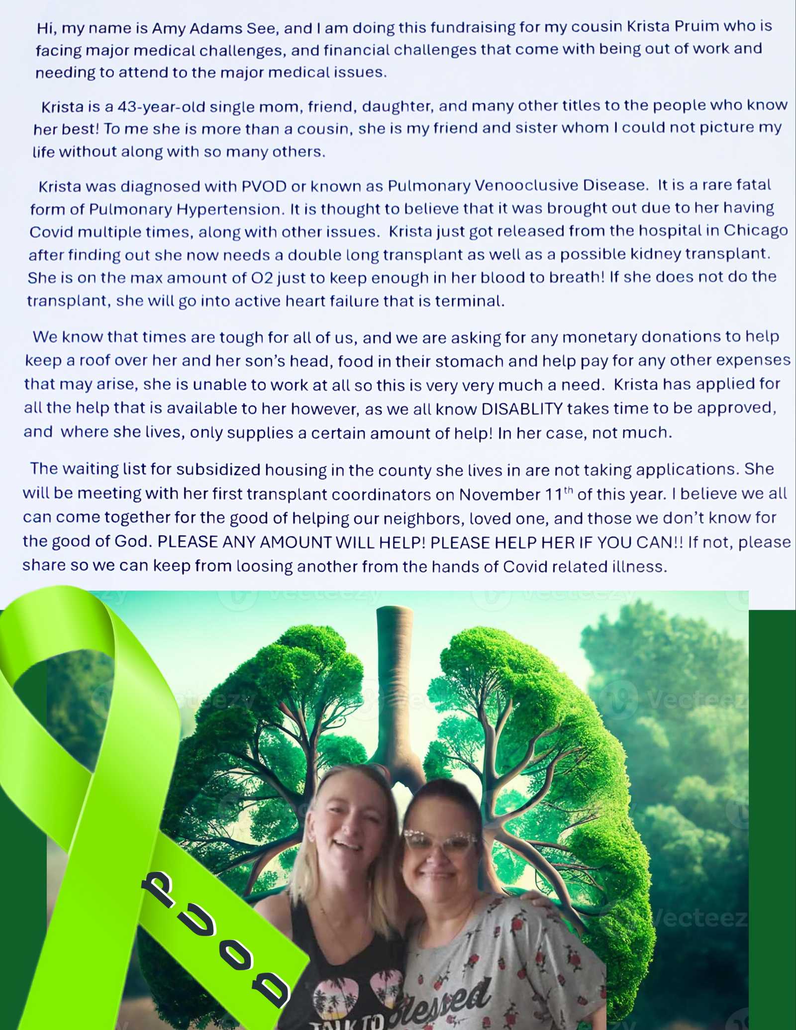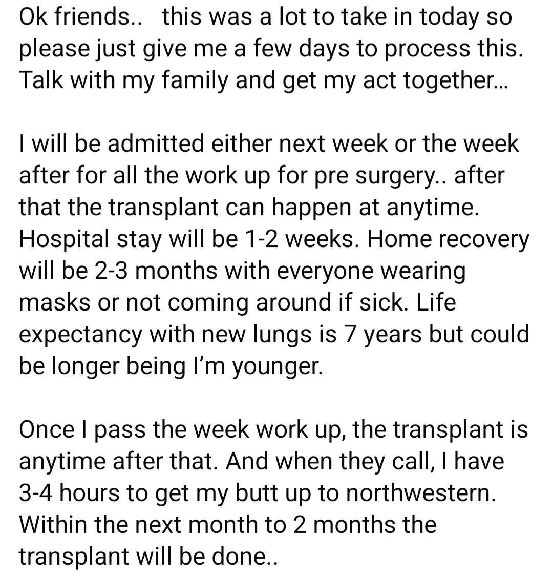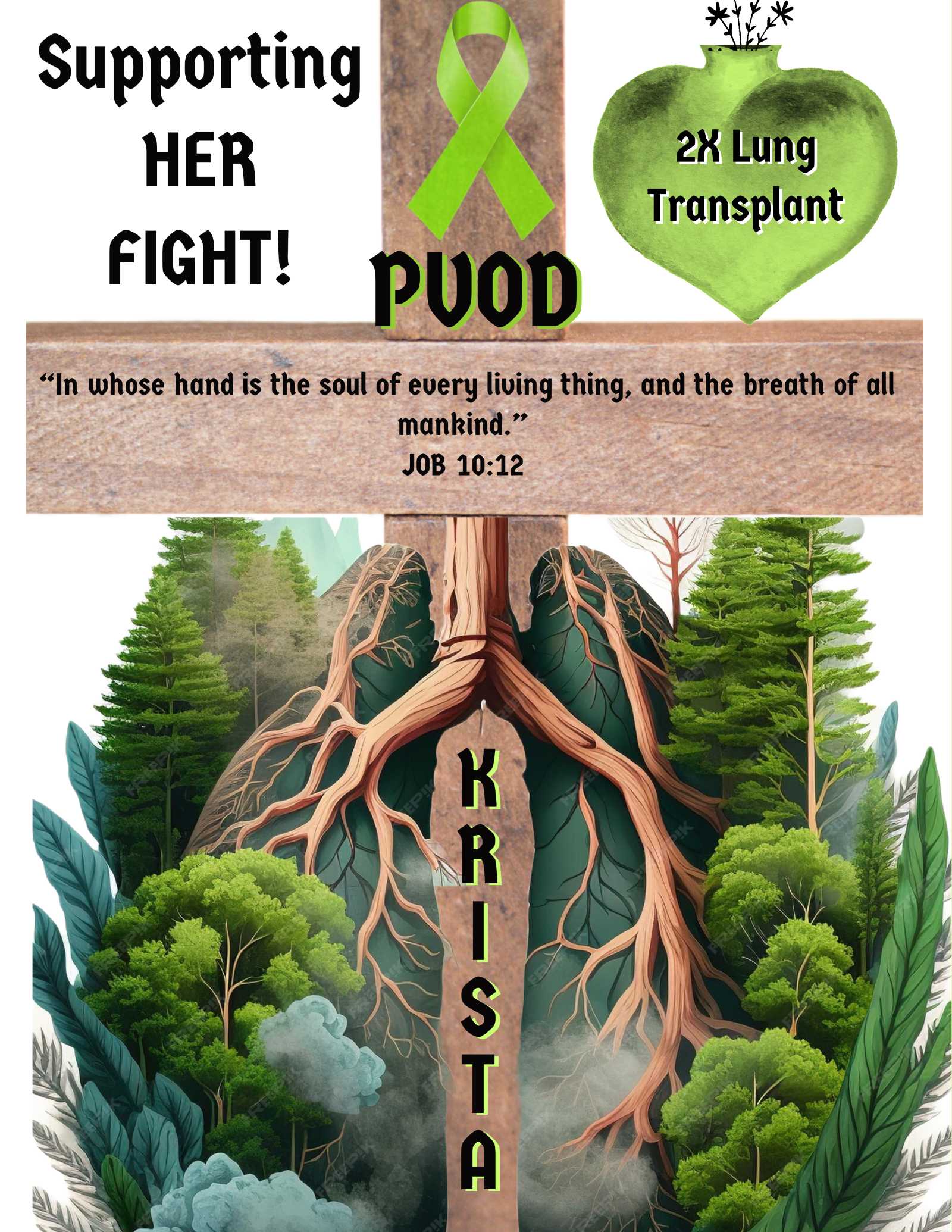 Krista has already overcome so much. Her journey began with a life-saving double lung transplant, a miraculous event that brought new hope and a chance to breathe freely again. But Krista's path to recovery is not over.After her discharge home, Krista was making strides towards healing. Yet, a recent appointment revealed a concerning drop in her oxygen levels, indicating that she is not yet out of the woods.Your support is crucial now more than ever. Krista's fight for a full recovery requires continuous medical care and support. Your donations can help cover the costs of the medical appointments and treatments necessary to monitor and stabilize her condition.Every dollar is a step forward for Krista, a step towards regaining her strength and living the life she dreams of. It’s a chance to stand by her side as she battles through these challenges with unwavering determination.Please consider donating today. Your generosity can provide Krista with the resources she needs to sustain her fight and ultimately triumph. Thank you for being a beacon of hope in Krista’s life.