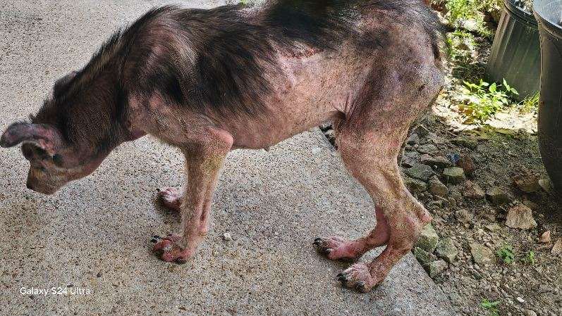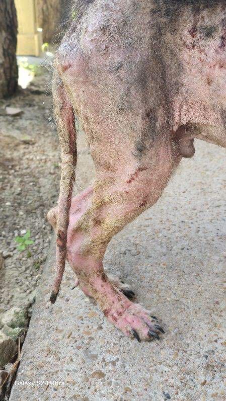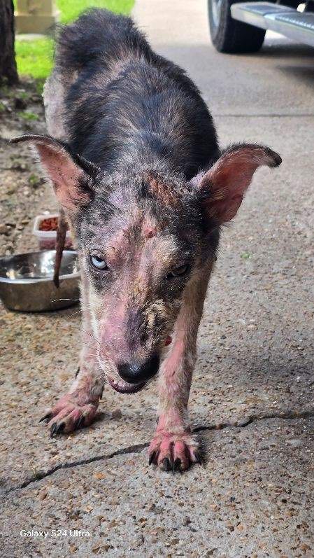 He wandered up to a cat food bowl in Houston—alone, raw-skinned, and barely hanging on. A kind stranger got him to safety, and now he needs urgent medical care.