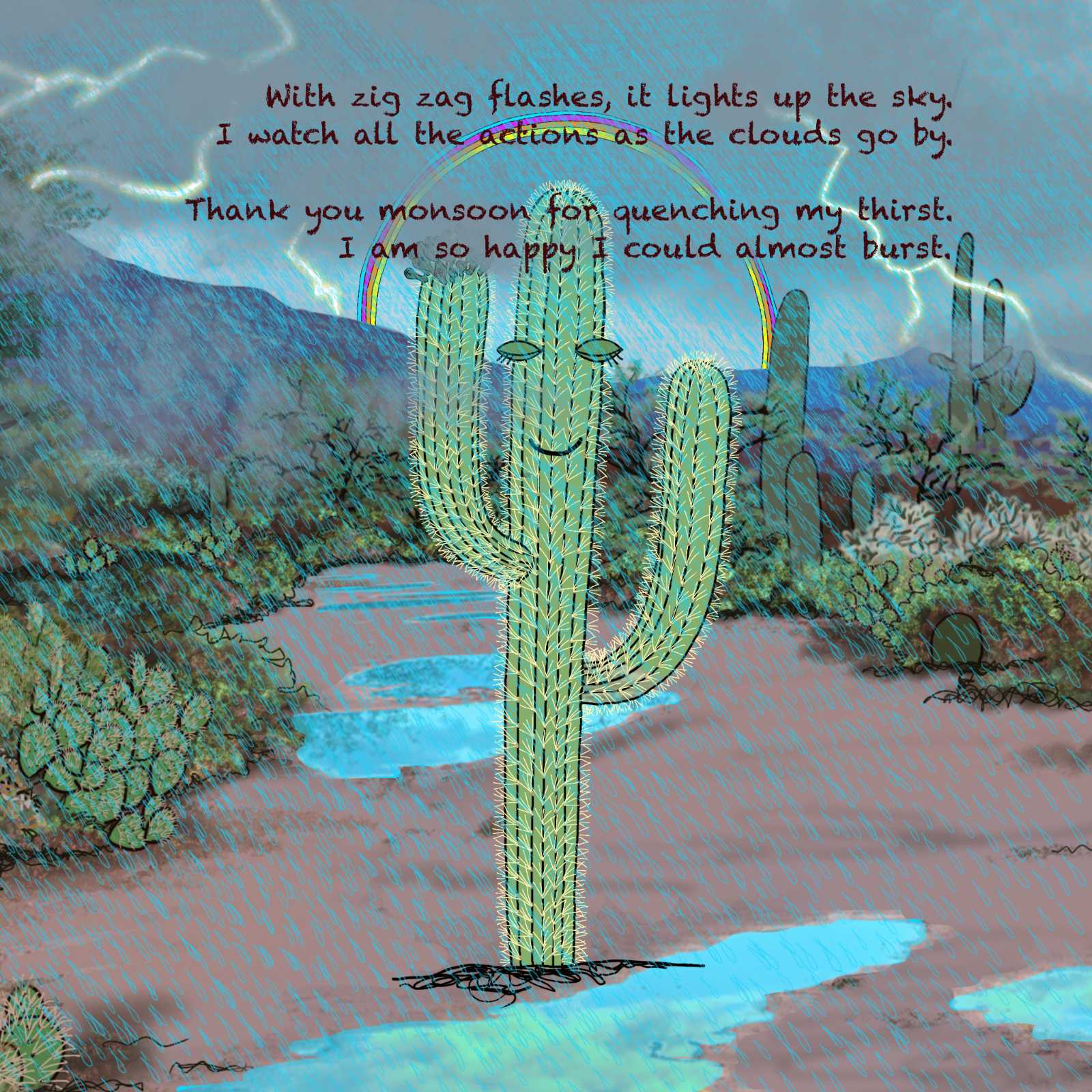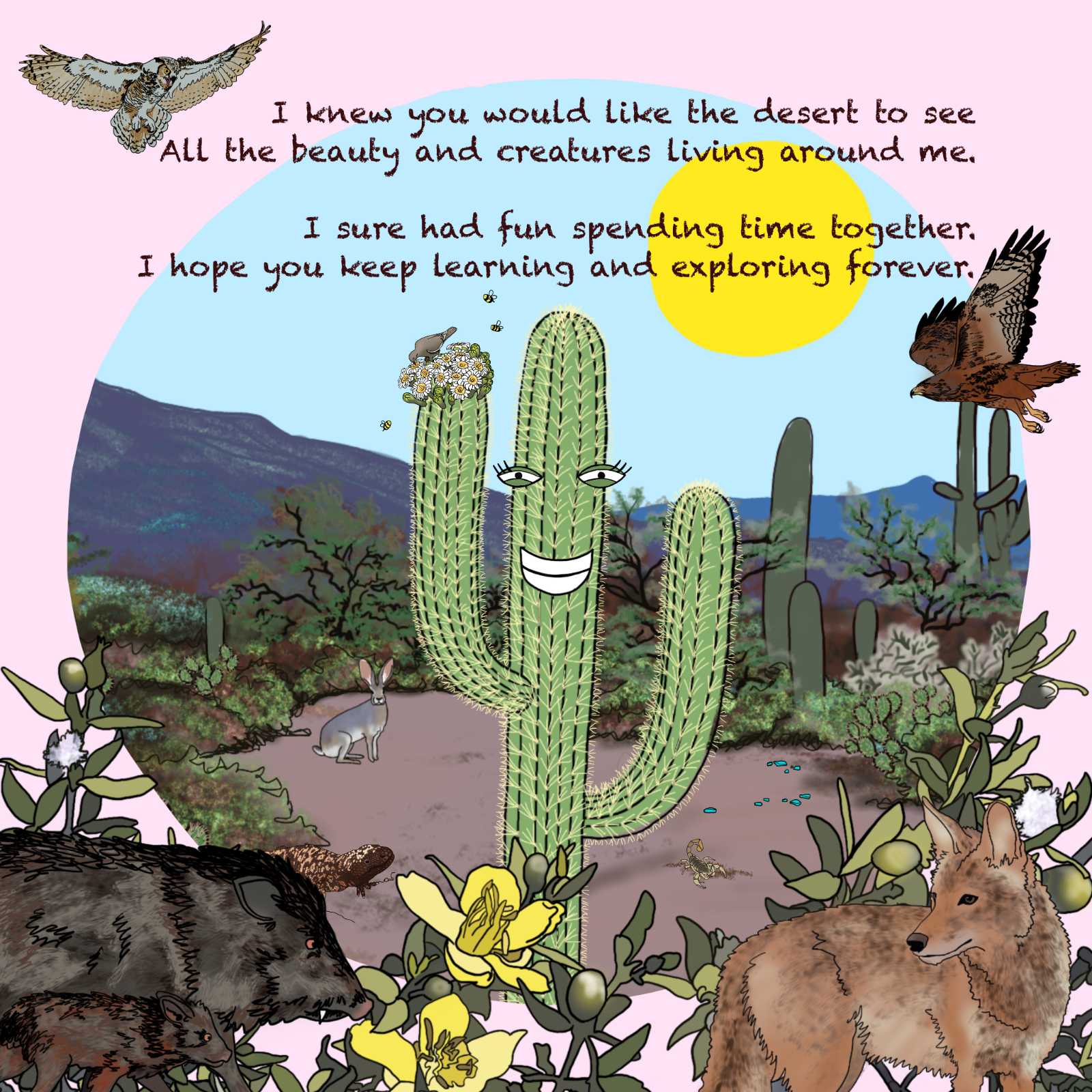 Sandy the Saguaro (suh-waa-row) and Her Desert Friends is a beautifully detailed full color illustrated nonfiction rhyming book. Sandy is a saguaro who grows up in the desert. In this book children and parents will have a fun time learning how saguaros live, how they develop and about the world and creatures around them.