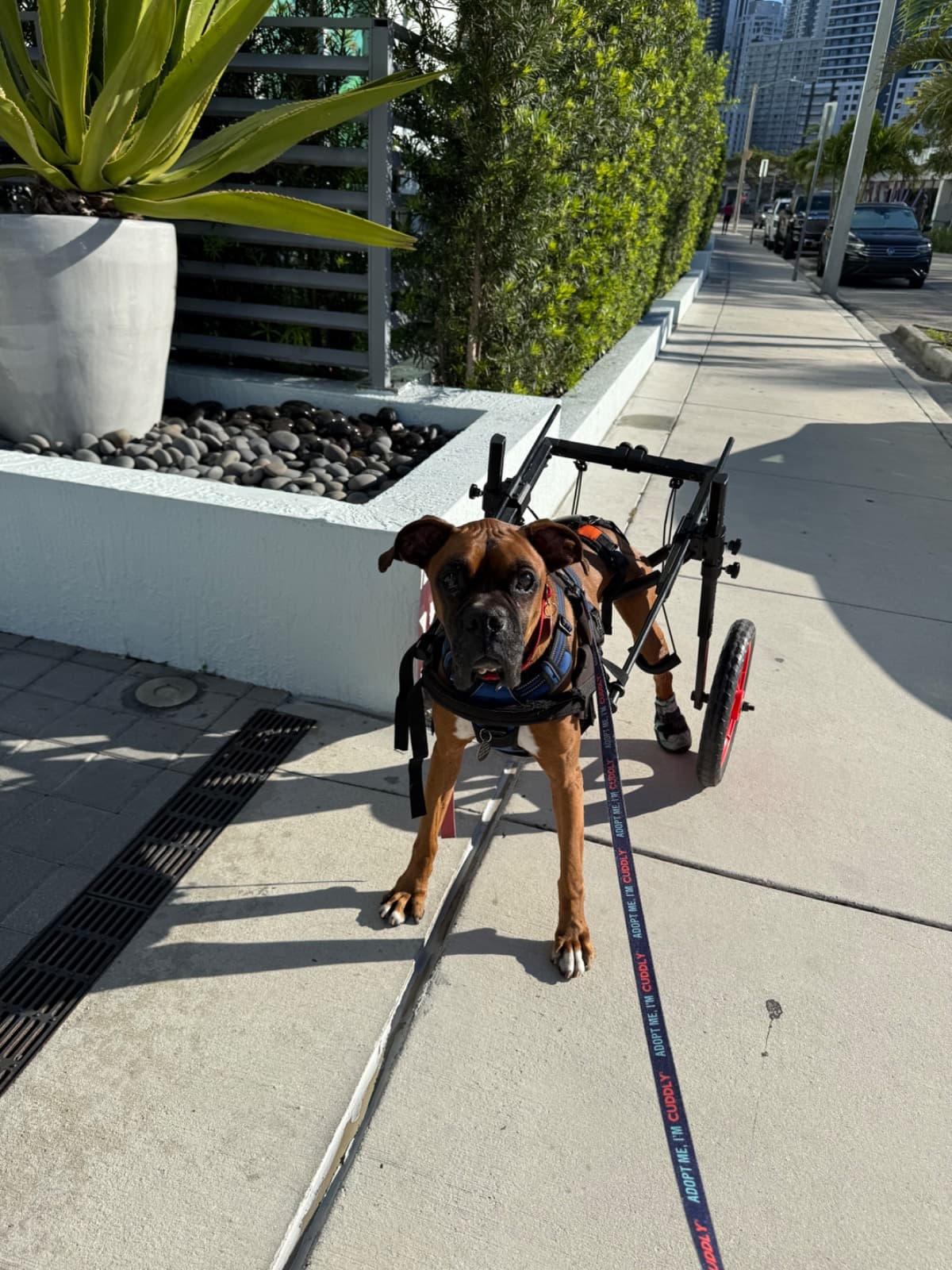 Jack came to me 4 months ago from Coastal Boxer Rescue looking for a foster mom as his condition began to progress but don’t you worry Jack does not let his DM phase him. He’s loves his wheels which help him stay active and allows him to keep up with his furiends.