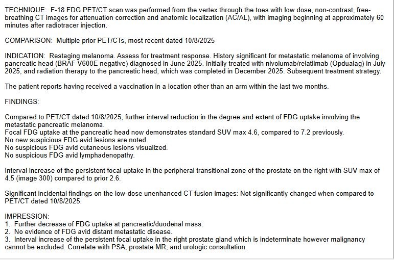He was diagnosed with Stage IV Metastatic Melanoma that has spread to his pancreas.