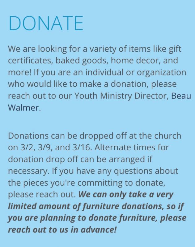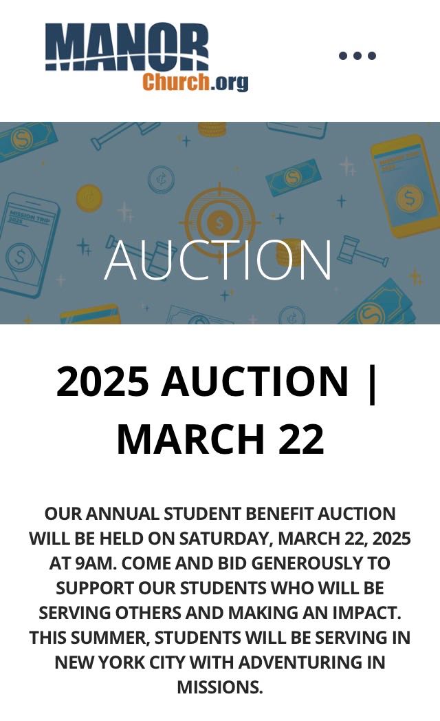 The total cost for this trip is $1,050 per student; however, through the generosity of our community, Manor Church will host a Students @ Manor Benefit Auction on March 22, which aims to lower this cost to $430. The auction will also help to support our dedicated leaders who will guide us with wisdom and love throughout this journey.