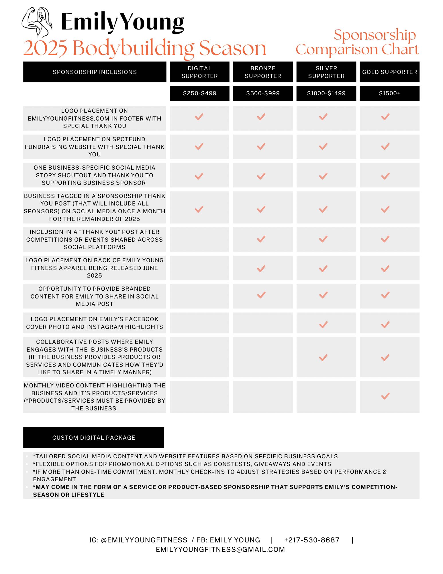 To become an official sponsor of my season, I have sponsorship packages and opportunities listed below. If you have a unique idea for collaboration that will support my journey AND your business, I’m open to discussing that as well! If interested, email emilyyoungfitness@gmail.com