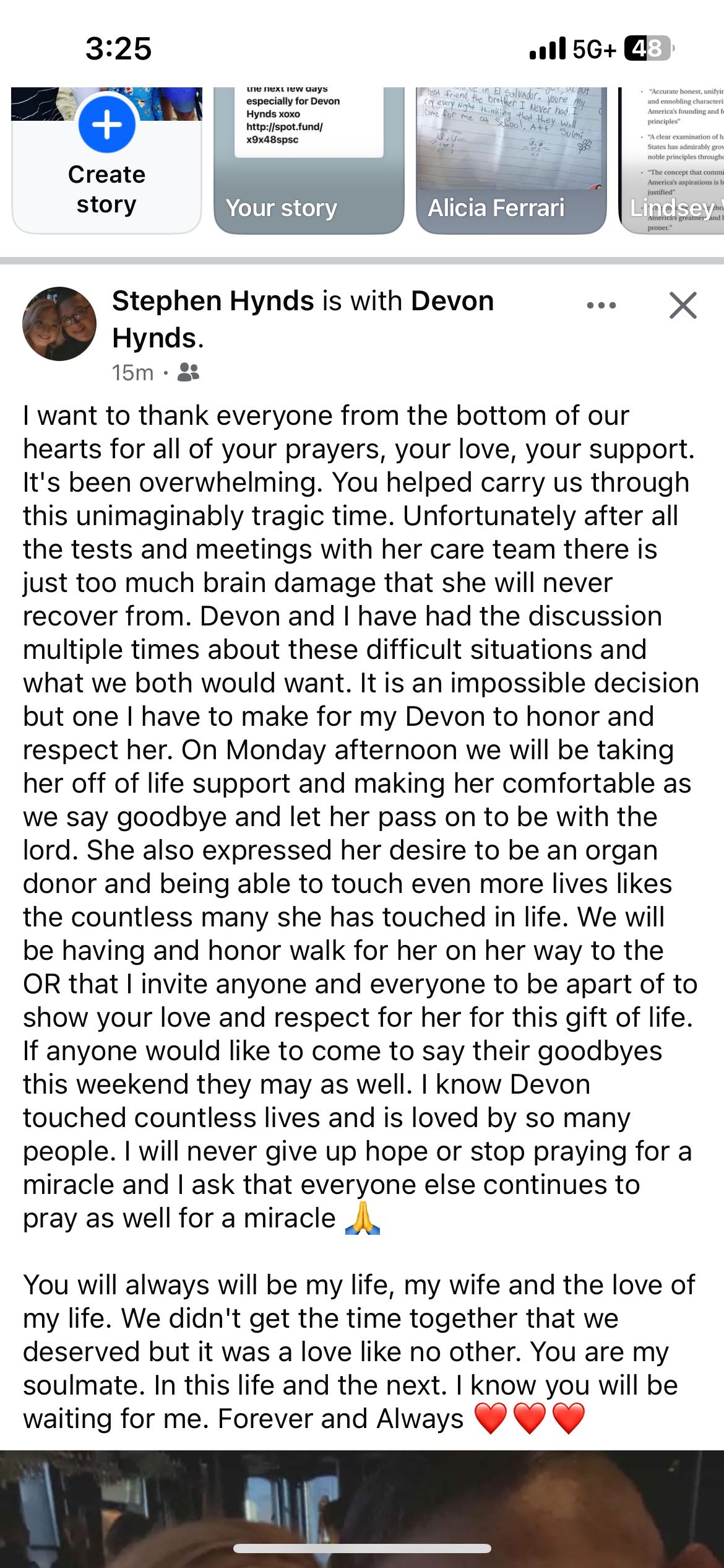 At 7:30 p.m. on February 9th Devon went home to be with the lord. I want to thank everyone for all of their prayers and support during this most difficult time of my life and our families lives. To see all the love that you had for my wife and the amount of lives and joy she brought to so many people brings some peace. I am feeling broken and lost right now and I don't know how I will do life without her. I know what she would want for not just me but for everyone that she loved, is to live life to the fullest and always bring joy to this world whenever possible. No matter what life threw her way or how hard things got, life never stole her smile or her ability to bring joy to others. She loved fiercely and was loyal beyond measure. She had an inspiring love for God that inspired faith in so many people and continues to do so now. She made the world so much brighter and left the world a better place. I will always do everything I can to honor her and keep her light alive. I know she is in a better place with so many people she loved waiting for all of us. She will always be with us in our hearts and our memories. Everyone is asking what they can do for me and all I can say is hold your loved ones extra tight and cherish every minute with them.