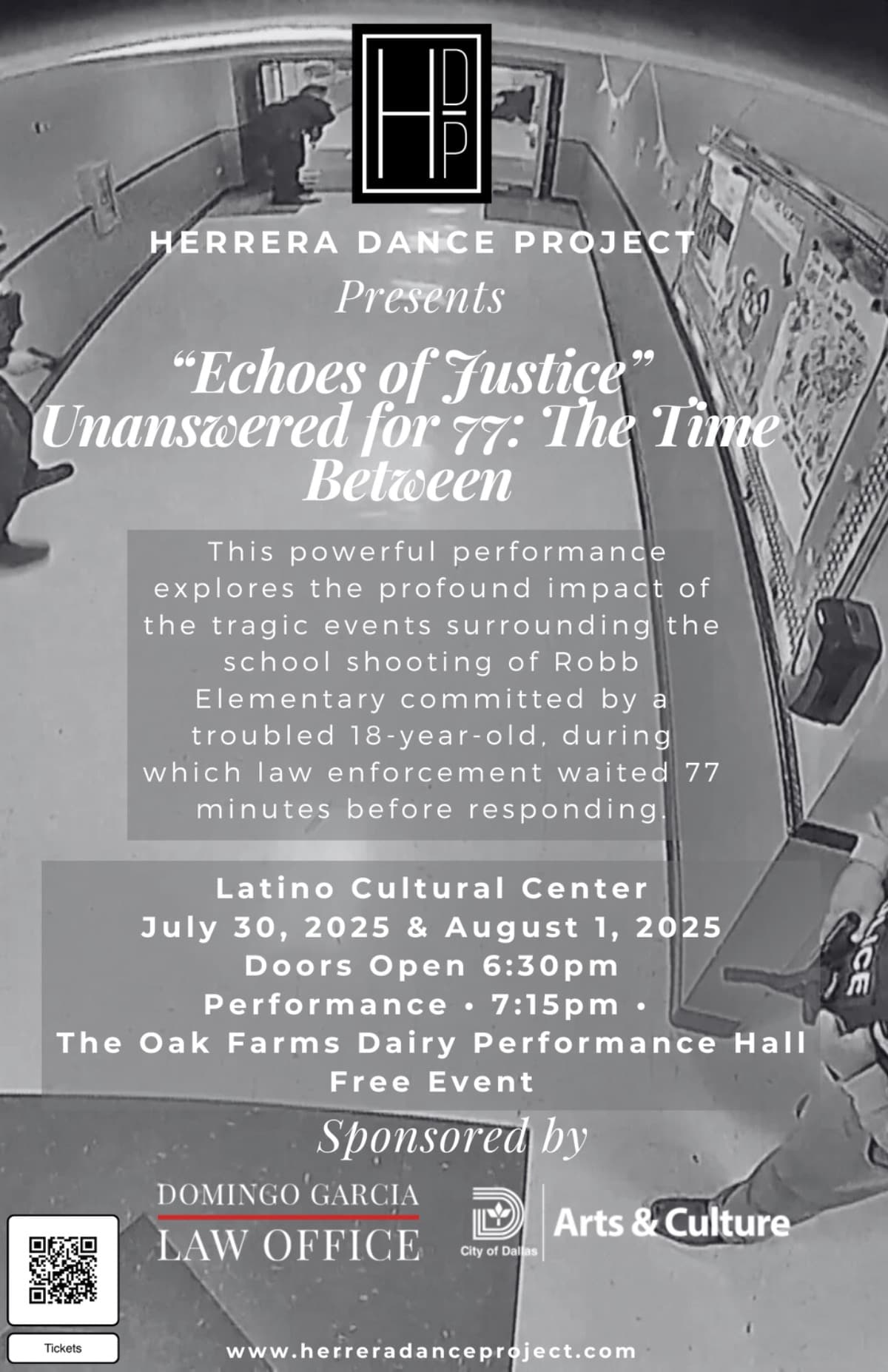 We are excited out to share an exciting and profoundly important initiative we are undertaking at Herrera Dance Project, our upcoming dance production titled "Echoes of Justice: Unanswered for 77. The Time Between." This powerful 77 minute choreographic exploration seeks to address the haunting 77 minutes at Robb Elementary School where teachers and students waited for law enforcement response during a critical moment of need.